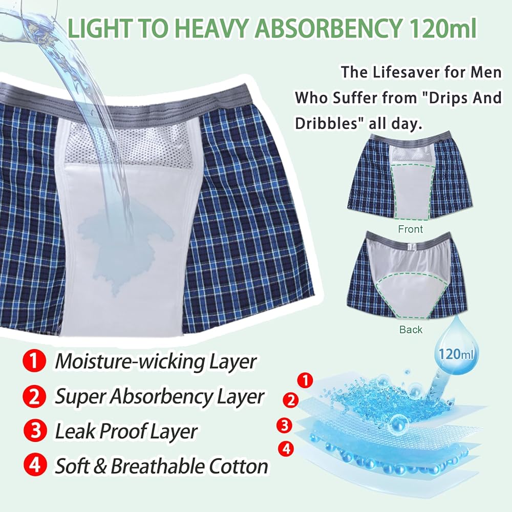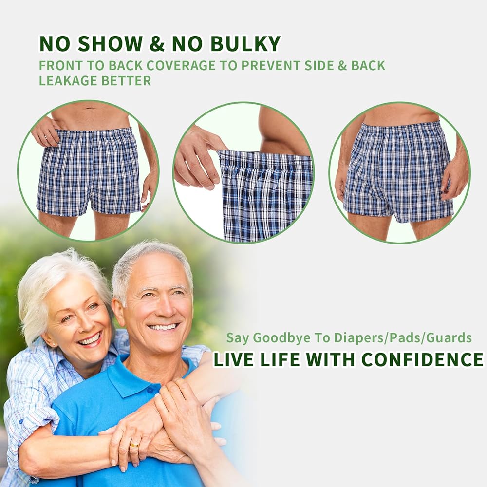 Efficient Absorption Layer - The men's incontinence underwear comes with a state-of-the-art four-layer hanging absorption structure, offering a comprehensive shield from front to back. Crafted with a comfortable loose elastic band to minimize abdominal tightness, they maintain the appearance of regular boxer briefs while providing leakproof assurance for your peace of mind. You can even wear the plaid boxers freely lounging at home.