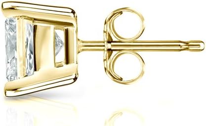 4-prong basket set princess-cut single diamond stud earring make a stylish statement. This 14k white or yellow gold stud earring sparkle with a total weight of 0.12 ct. and are available with push-back clasp.