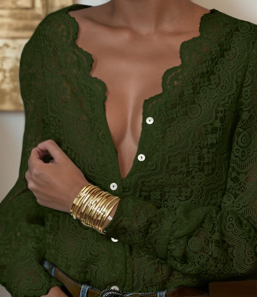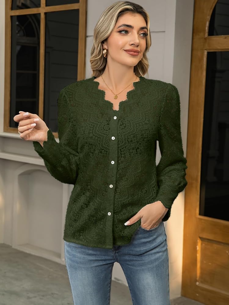 Lace Tops for Women Dressy Casual Blouses Puff Long Sleeve V Neck Button Down Business Work Shirts