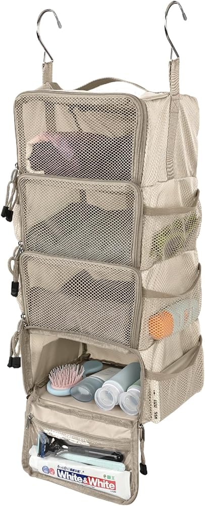 Practical: The travel hanging shelves have 4 compartments and 3 mesh pockets on each side allowing you to categorize items. Easy access and neat arrangement of belongings such as clothing, accessories, or travel essentials. Inside the bottom compartment is a waterproof toiletry bag ideal for storing essentials like toothbrushes, toothpaste, and razors.
