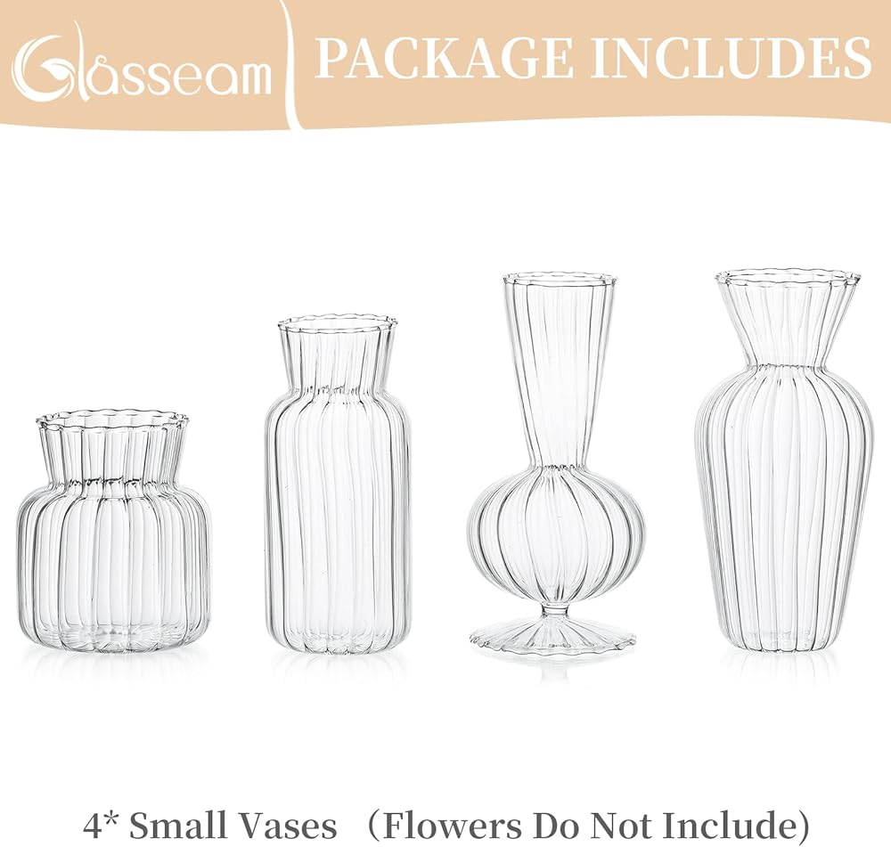 Premium Bud Vases: Made of qualified high borosilicate glass, these ribbed small vases for flowers have smooth opening and scratch resistant surface. Compared with the most ordinary glass vase, they have higher transparency and more stylish shapes even though they are not as thick as the ordinary glass.
