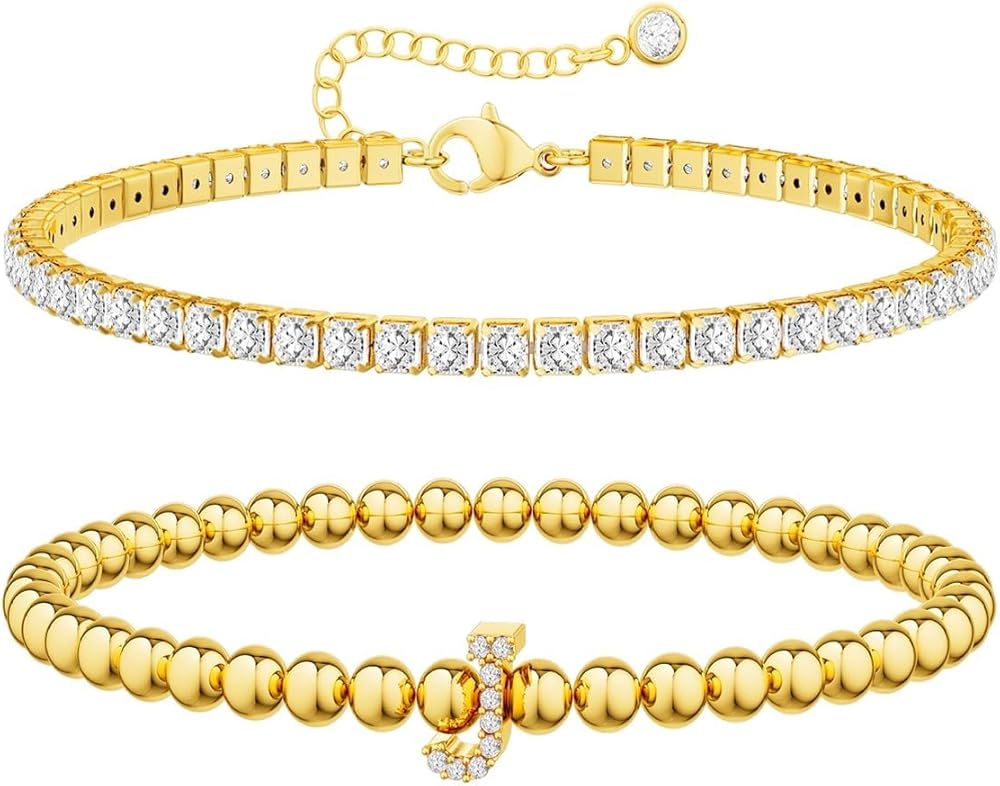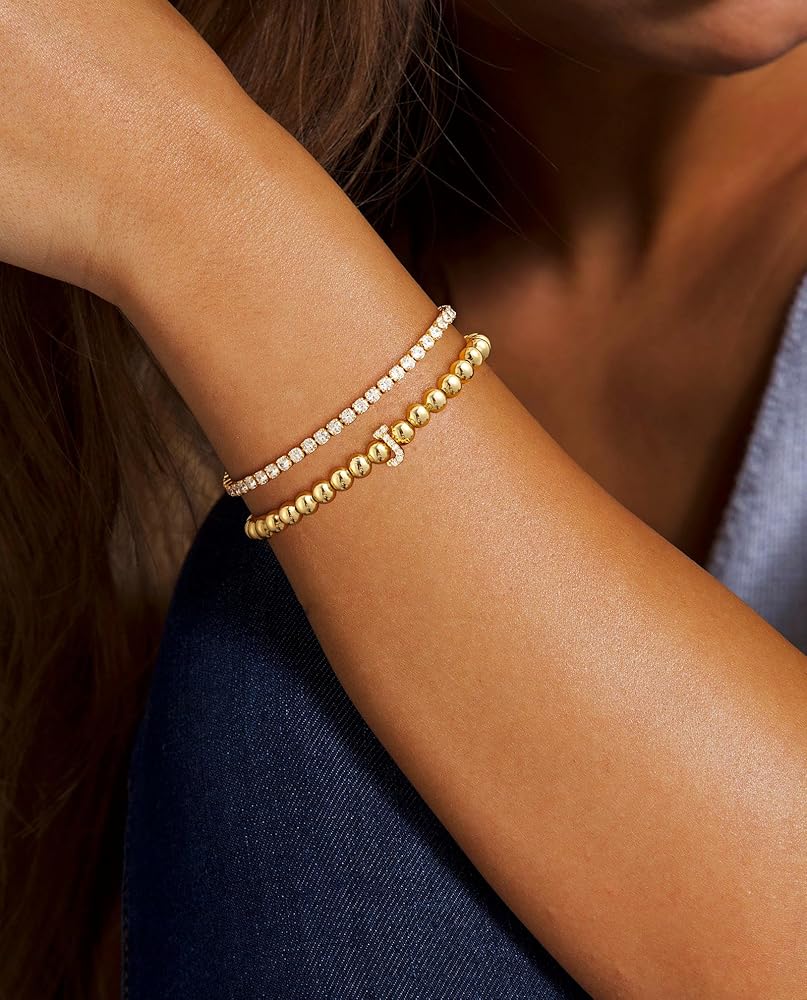 Initial 14K Gold Plated Bracelets for Women, Letter Bracelet Beaded Cubic Zirconia Tennis Bracelets for Women Trendy Fashion Jewelry for Women, Initial A-Z