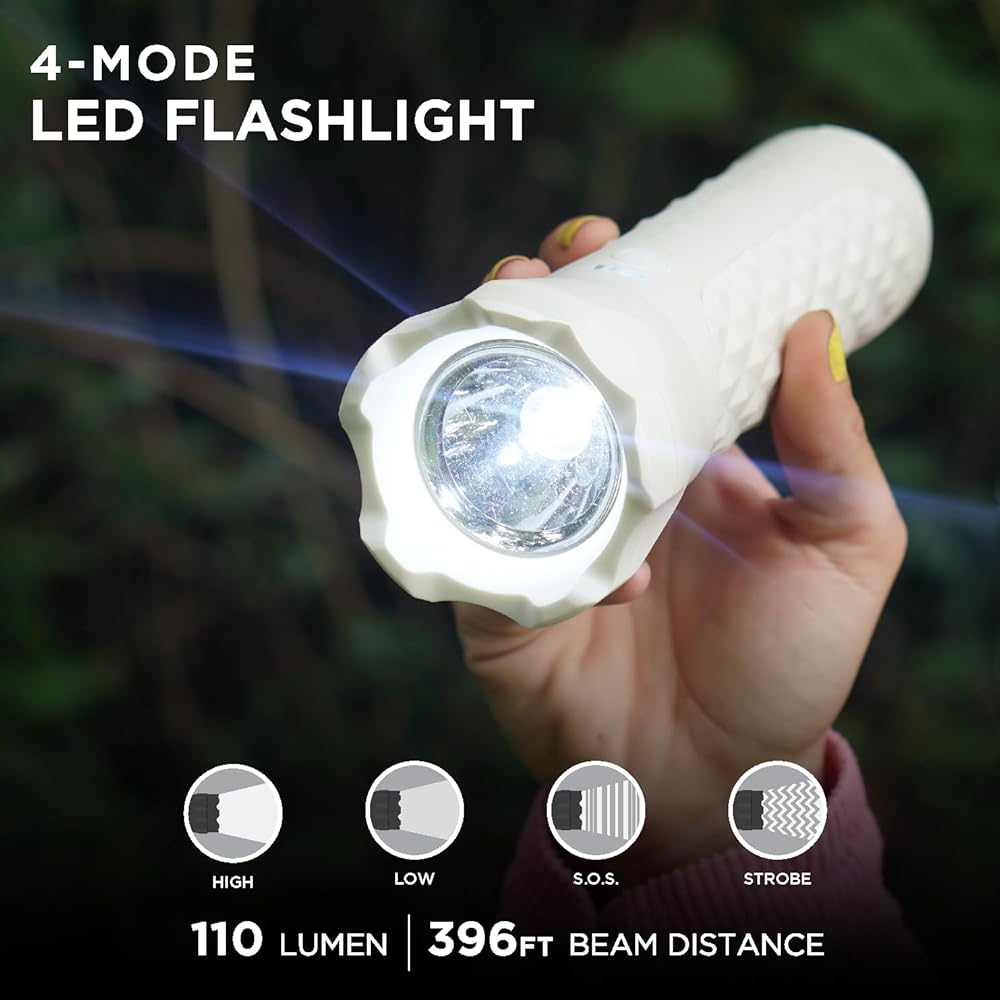 4-Mode LED Flashlight - Lightweight 110-Lumen LED Flashlight has 4-Modes (High Beam, Low Beam, S.O.S. & Strobe). 396ft reach is the perfect tool for daily use, traveling, outdoor activities, and in emergency situations.