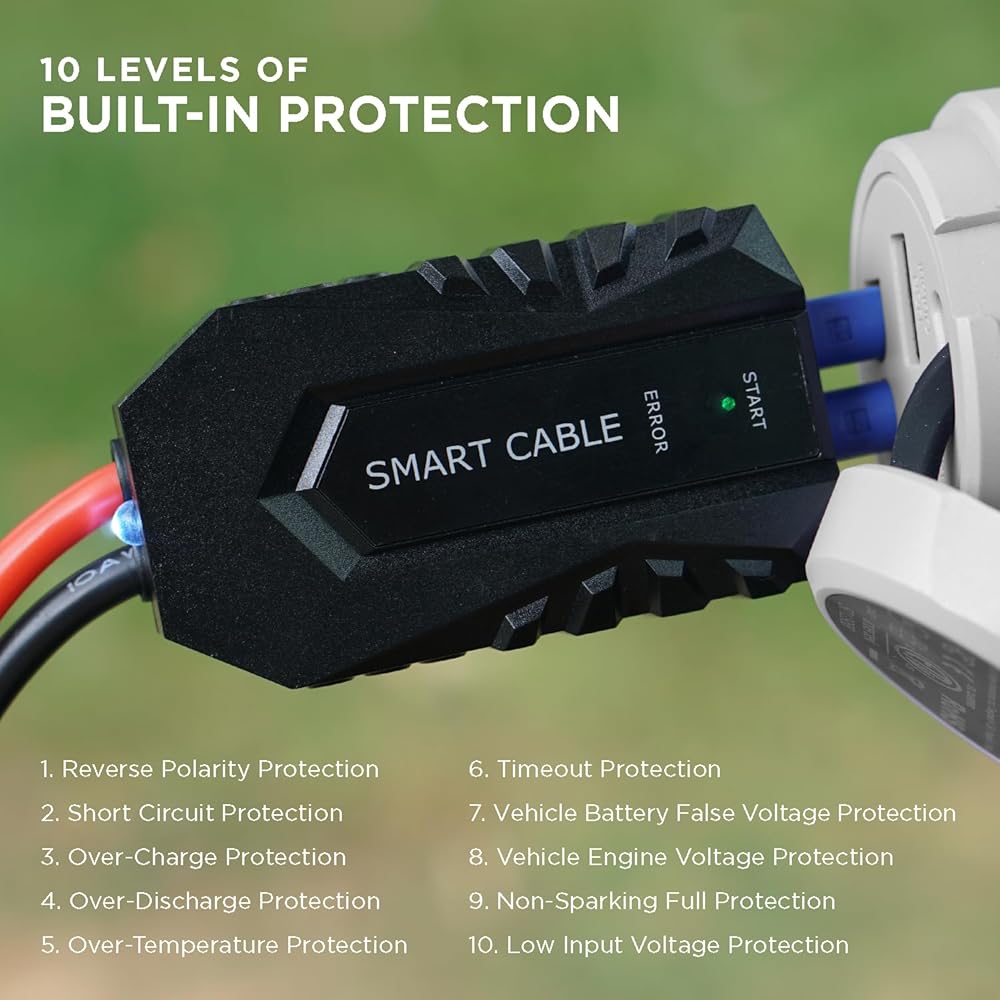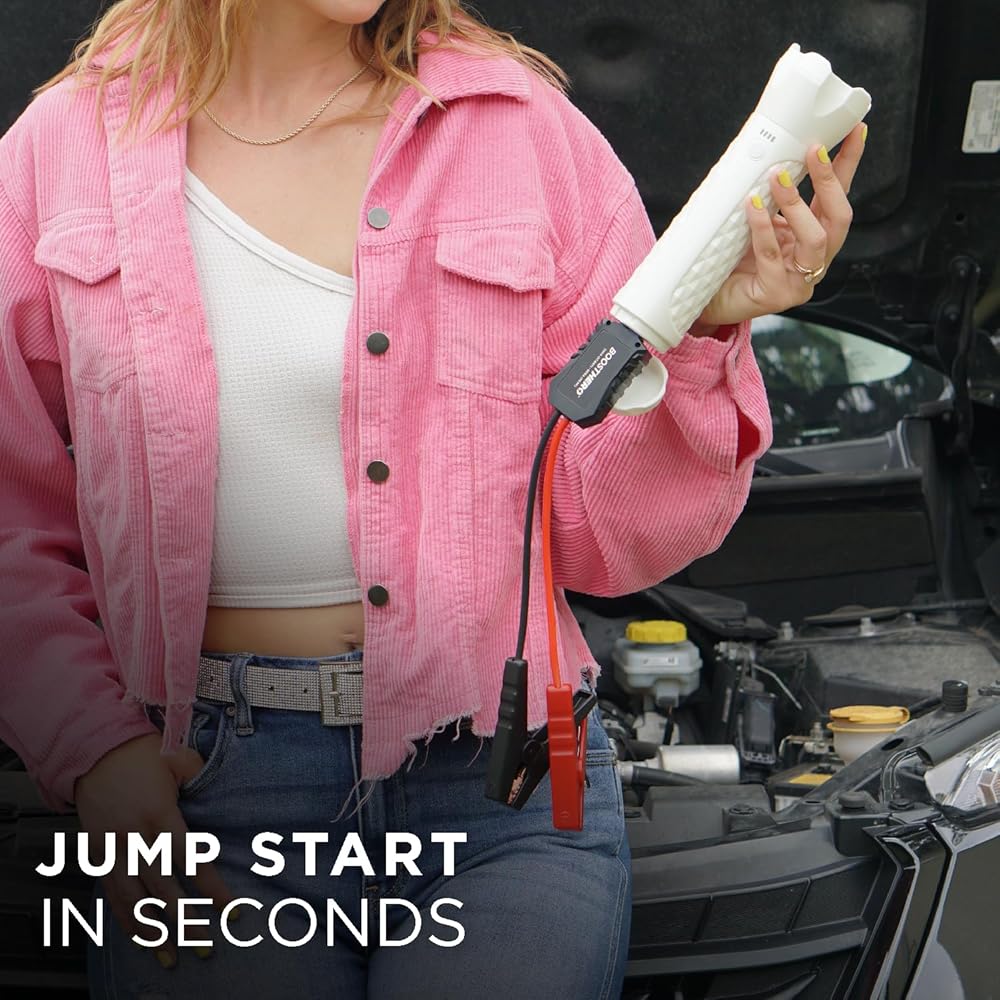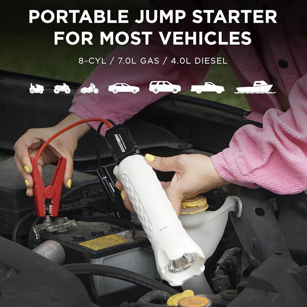 Universal Jump Starter - The BoostHero is powerful enough to jump start most cars, trucks, SUV's, boats, motorcycles, lawn mowers, ATV's, and more! Instantly jump a drained vehicle battery by clamping the Smart Jumper Cables with the patent-pending mini flashlight directly onto the vehicle battery terminals. Powerful 800A peak current to jump-start vehicles with up to 6.0L gas or 4.0L diesel engines.