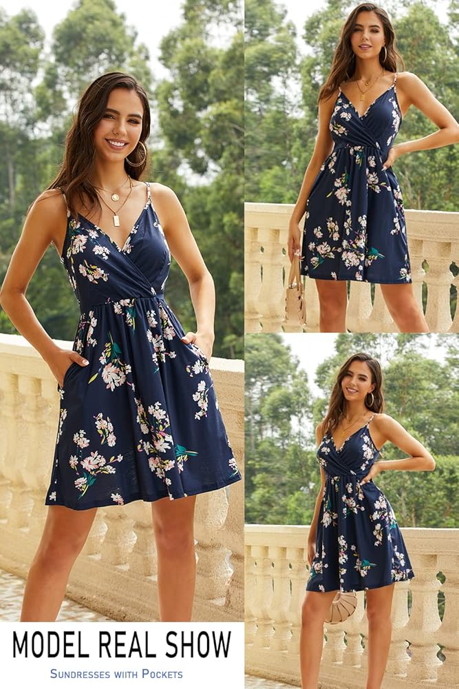 STYLEWORD Women's V Neck Floral Spaghetti Strap Summer Casual Swing Dress with Pocket
