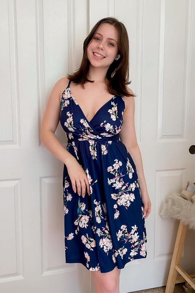 This sleeveless floral dress comes with V neck two side pockets,and elastic waist.This is an essential part of your wardrobe.