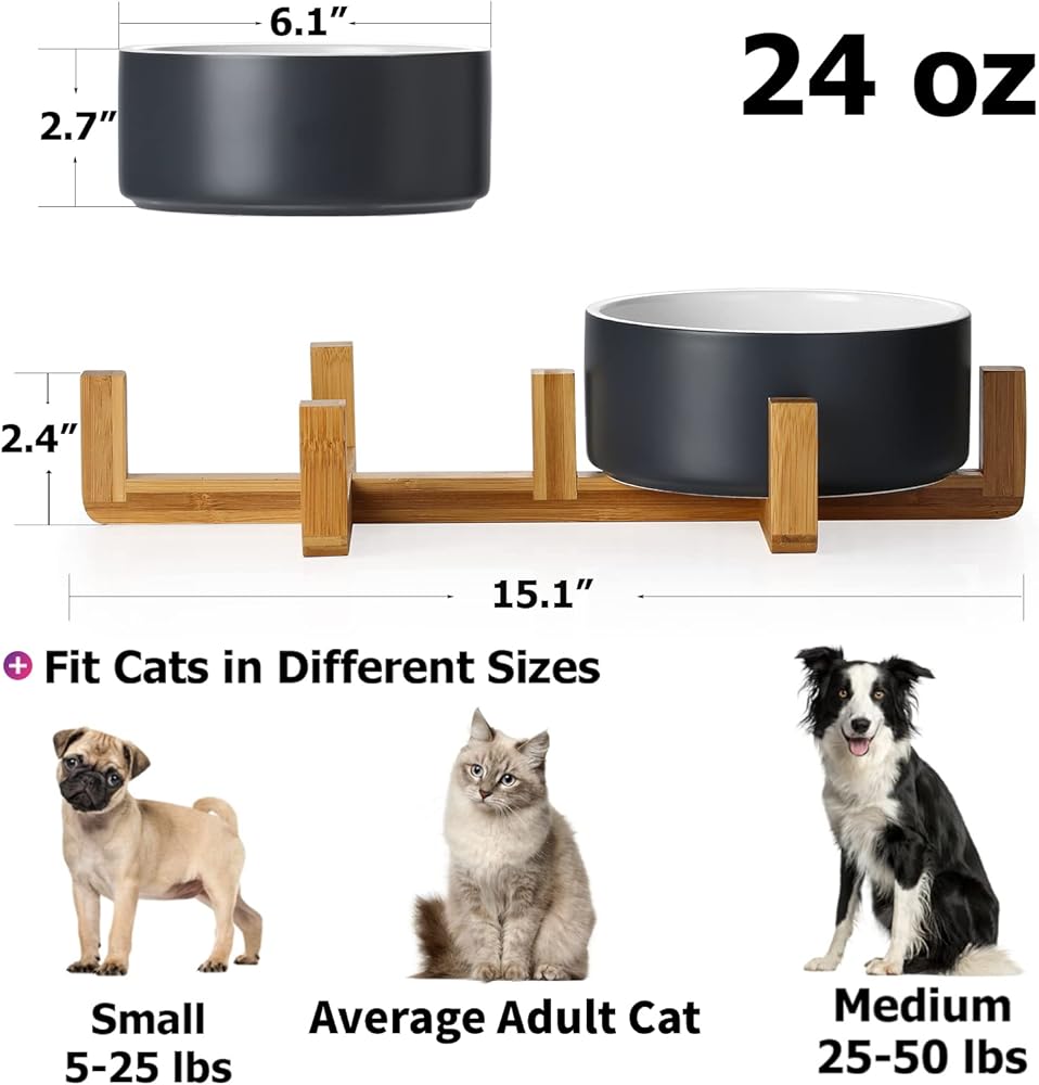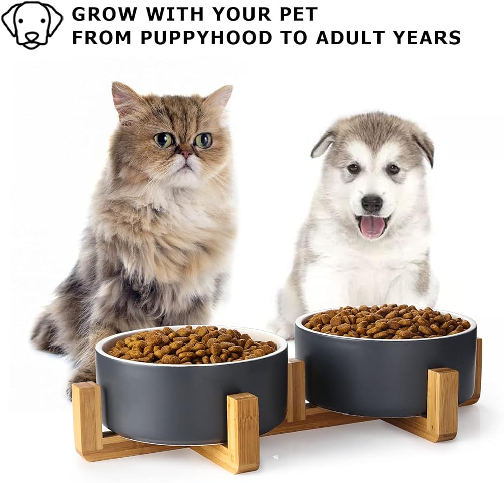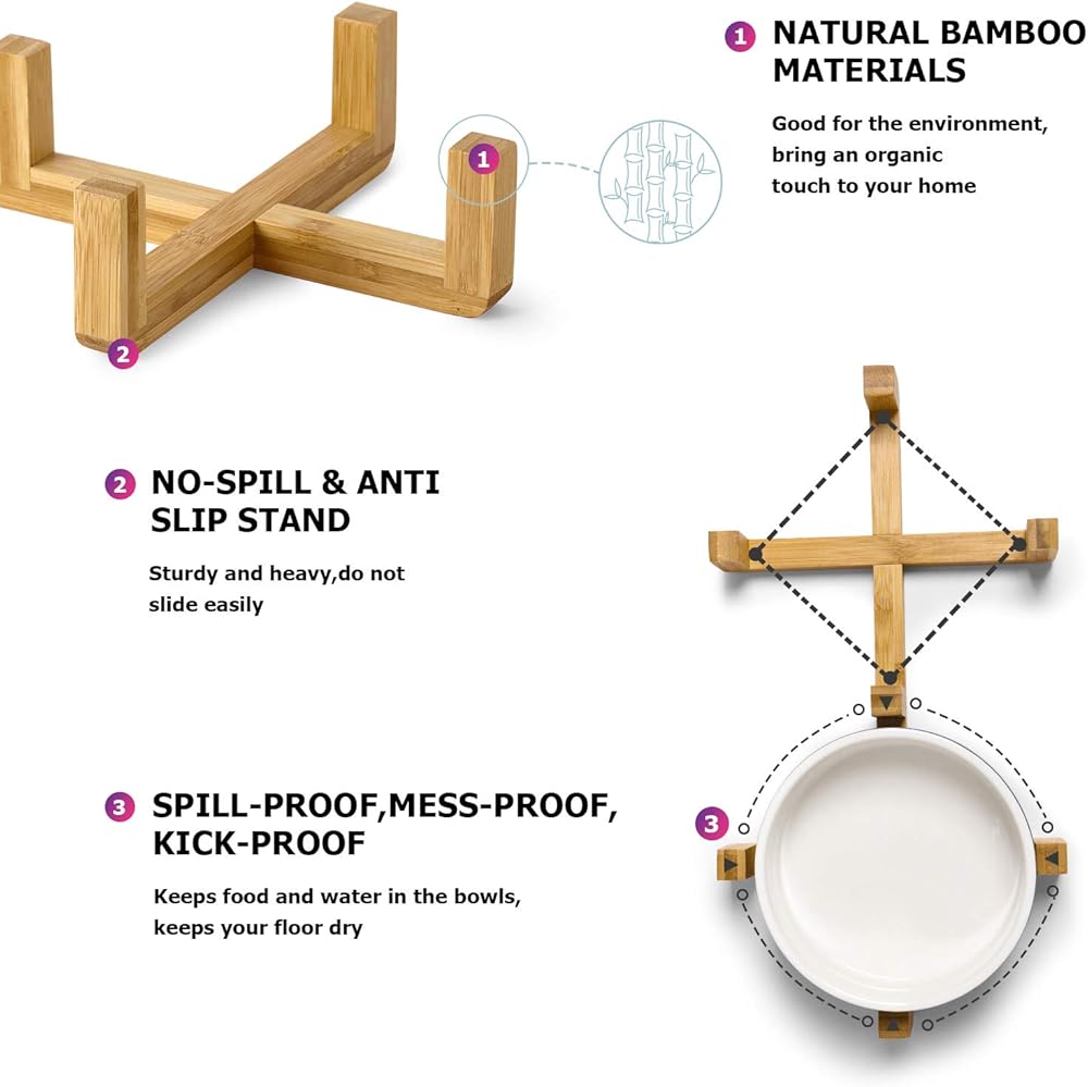 Double Bowls Set: One dog bowl for food and one for water, Each ceramic cat bowl has a Unique bamboo stand. Microwave and dishwasher safe