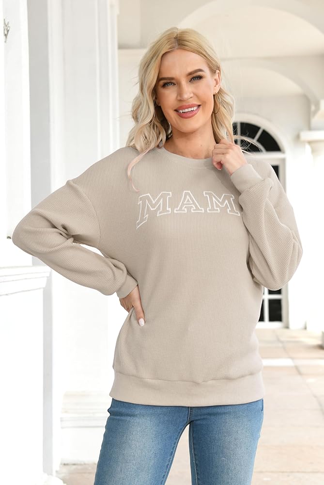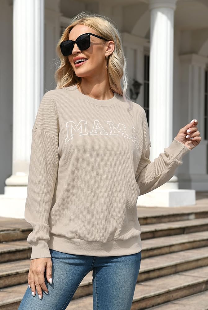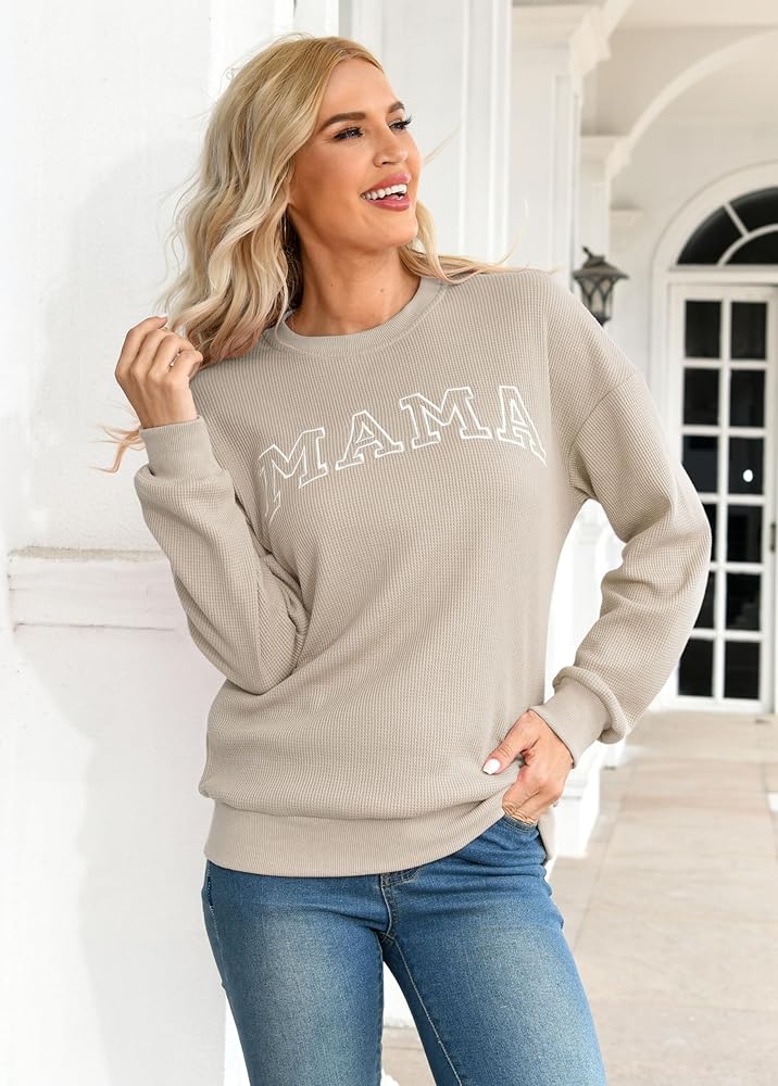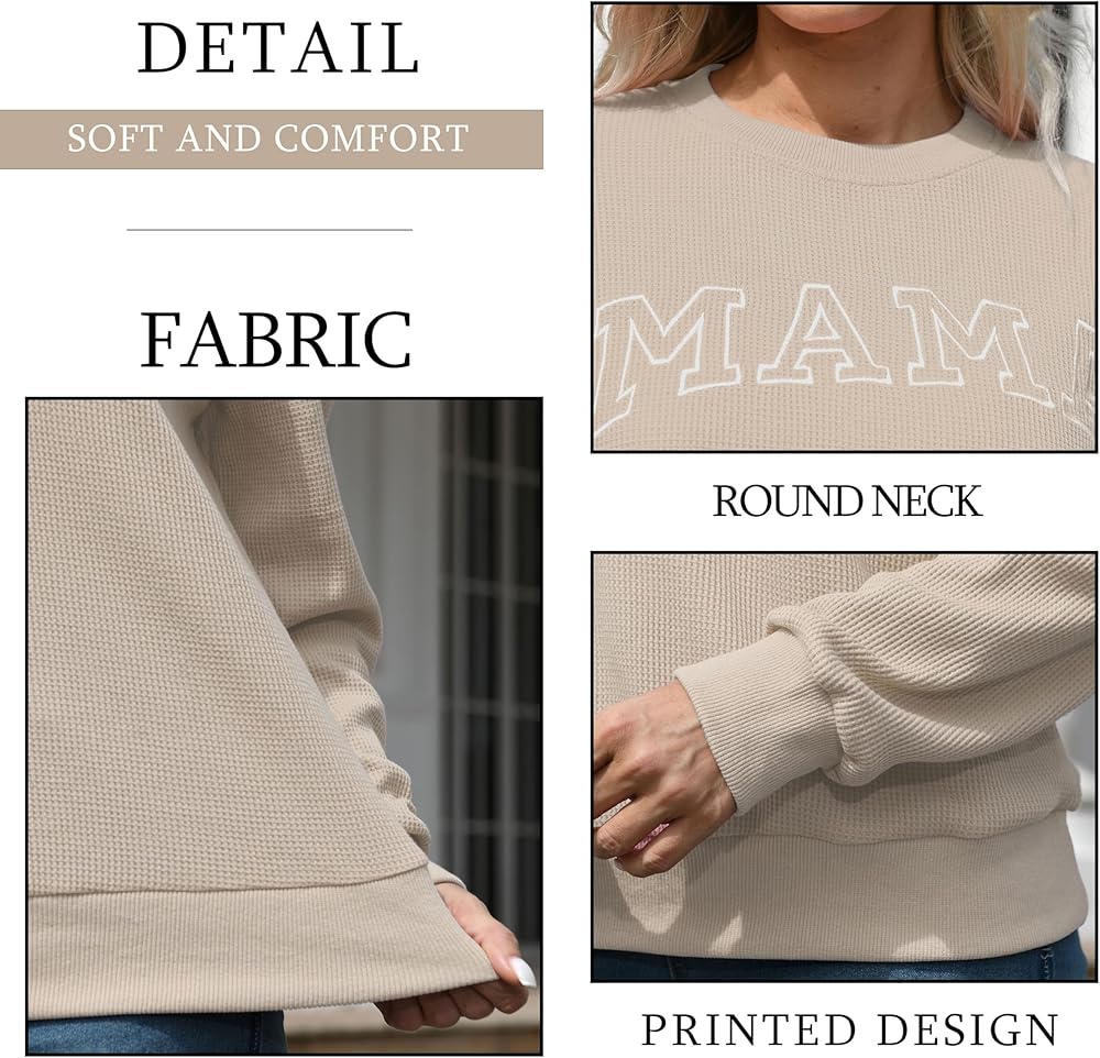 Crafted from a soft waffle knit fabric, this mama sweatshirt for women graphic sweatshirts for moms mama letter print shirt waffle knit tops for women features an cute embroidered "mama" design that showcases your pride as a mom.
