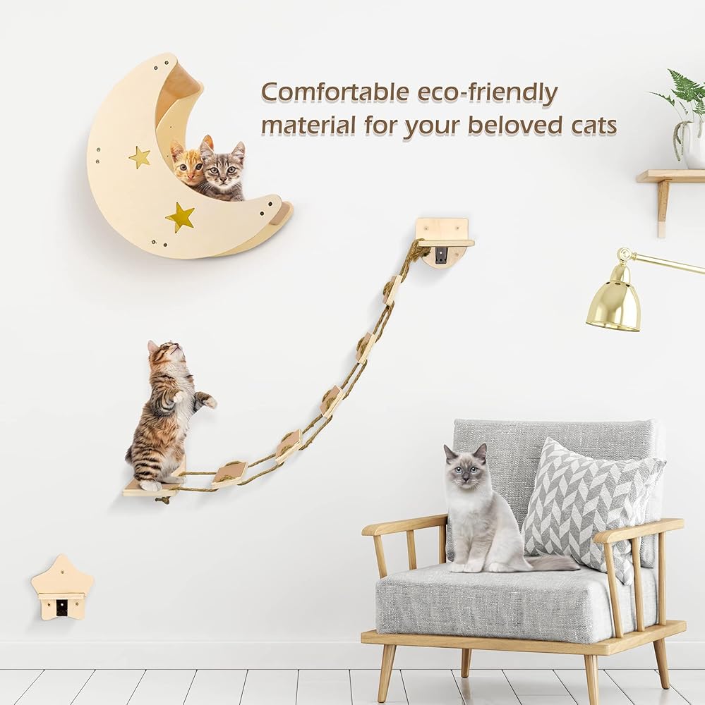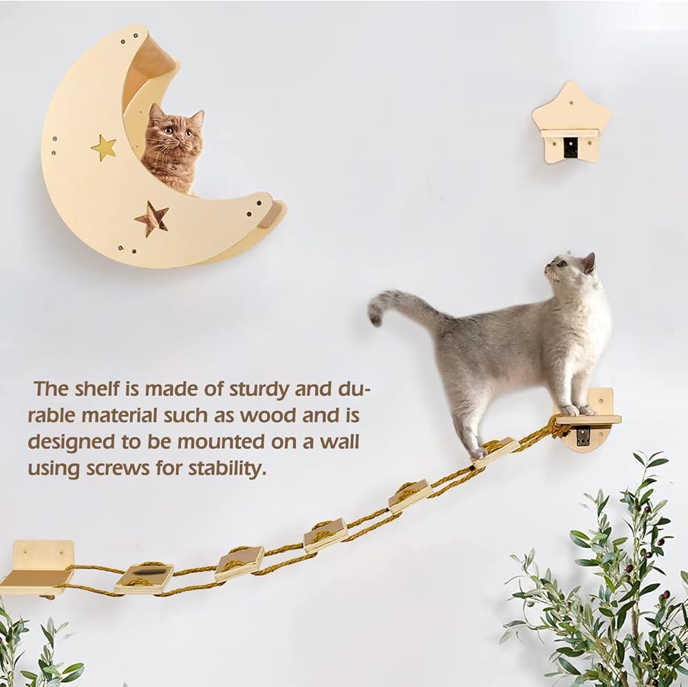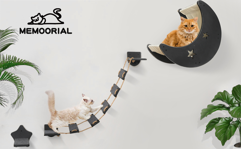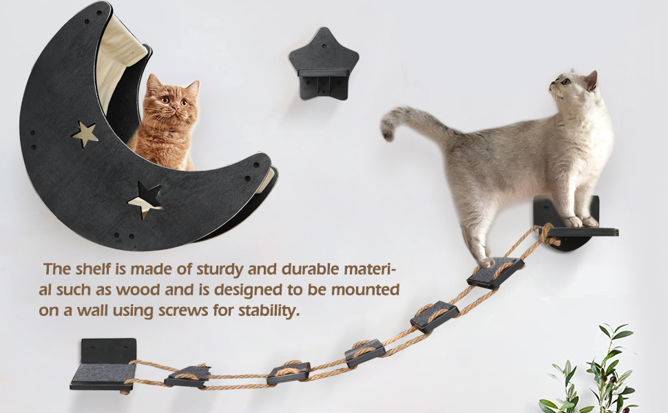 😽Unique and Creative Cat Wall Shelves : This cat shelves are carefully designed by our cat loving designer. As you can see, it is a moon shaped cat shelf. Isn't it special. And we also have a cat bridge and cat step, so you can enjoy DIY on the wall. The distance of the cat bridge is long enough for you to install it in any space. Create a perfect and comfortable activity and rest space for cats.