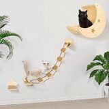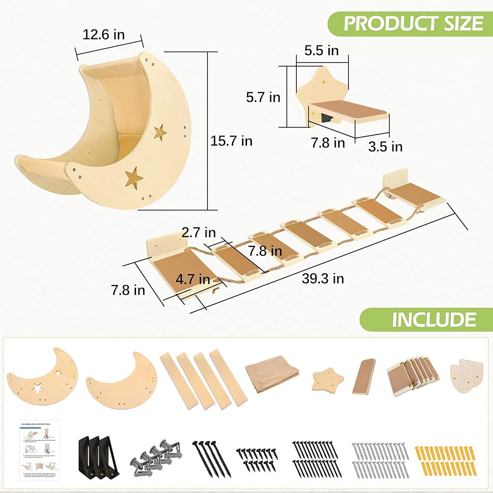 😽Large Space Cat Shelf and Perch for Playing and Rest : The dimensions of moon cat hammock is 12.6*15.7inch, cat walk bridge is 39.3*7.8inch, star cat step is 8*3.5inch, providing a large enough space for cats up to 20lbs, creating more possiblities to play, jump and snap, they can spend their whole day on the cat wall shelves except eating and washroom time. The moon cat bed can also be placed on the floor as a swing cat hammock to give more fun to your furry babies.