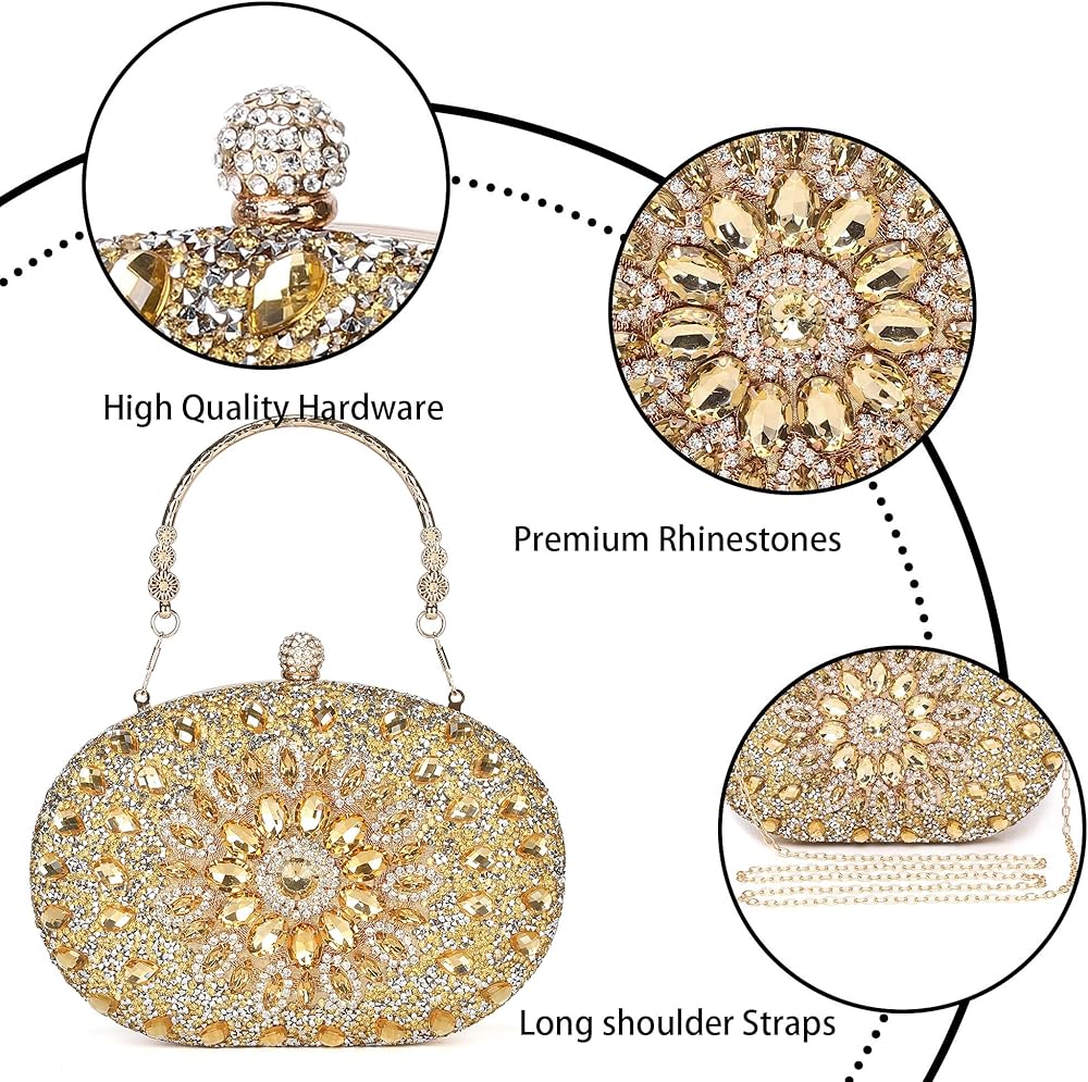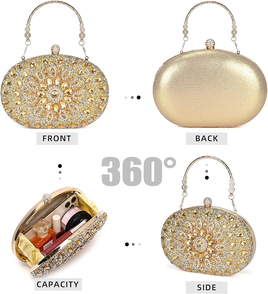 ❥ [Unique Design] Clutch purses for women with gold metal frame,push lock design. A handmade, gemstone sunflower is the highlight of this bag. Multicolored crystals with gold chain and carrying handle, stylish and beautiful, showing a charming and noble temperament.