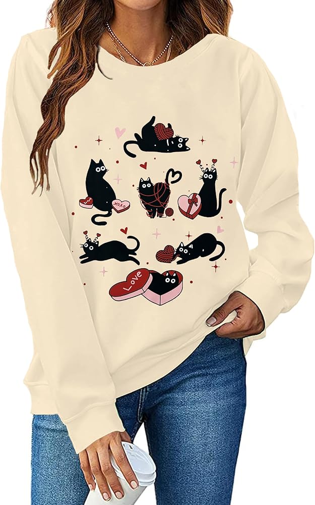 FEATURES : Cute black cat graphic and love heart print , casual lightweight long sleeve sweatshirt, classical crewneck design , make it fashion and simple. Unique and funny design , and this is a good choice for valentine's day.