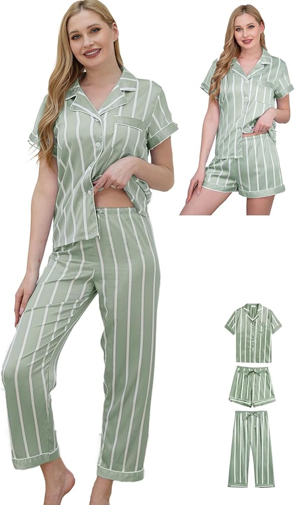 ❀3PCS PAJAMA SET FOR WOMEN PER PACK INCLUDES: 1xShort Sleeves Top, 1xLong Pant, 1xShorts, SIZE RANGE: XS-S-M-L-XL-XXL=6Sizes. Classic short sleeve silk pajama sets with sufficient quantity and elegant quality to satisfy the needs of you. Please check carefully before order!