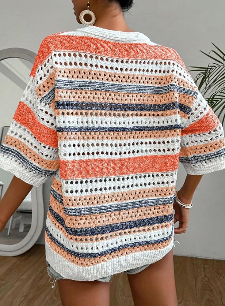 Design: This stylish striped sweater features a fishnet ribbed knit for a comfortable, sexy feel. The loose v neck, short sleeves and crochet style will make for a cool summer day.
