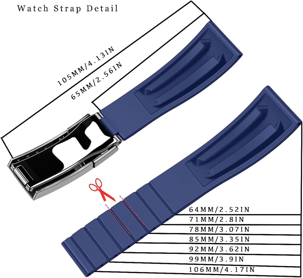 Length Adjustability: The 20mm 22mm rubber silicone watch band comes with perforations along its length, allowing you to precisely adjust the size by cutting along the perforations. This ensures a customized fit that perfectly contours your wrist, regardless of its size. Optimal Fit: Designed to fit wrists 5.5 inches to 7.26 inches