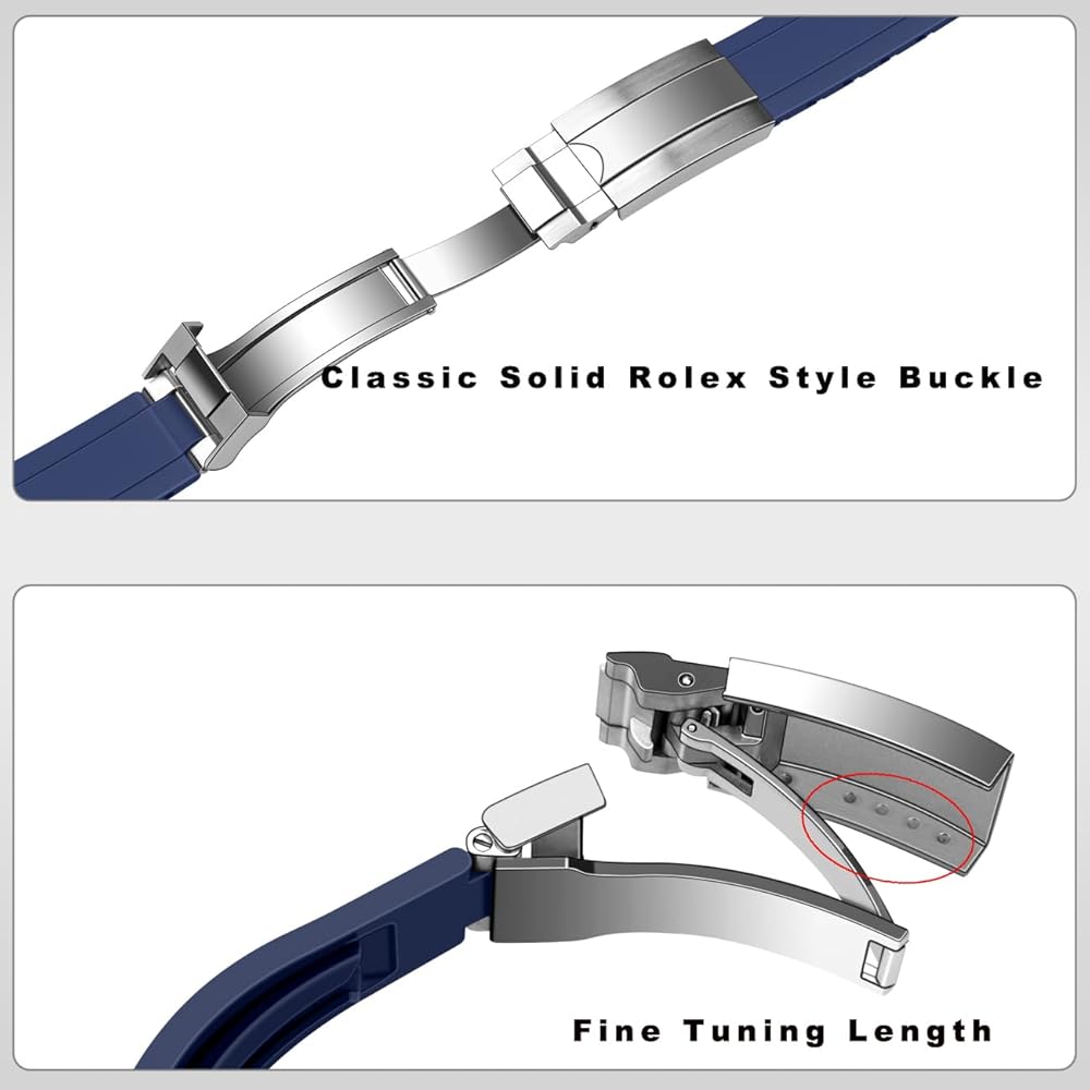 Classic Stainless Steel Diving Clasp with Adjustable Length: Securing your watch in style, our rubber watch band for galaxy watch features a solid stainless steel fold-over buckle that not only looks elegant but also ensures a secure fit. The reliable oyster clasp is designed for 4 small holes to fine adjustment, allowing you to customize the length of the rubber strap to perfectly fit your wrist