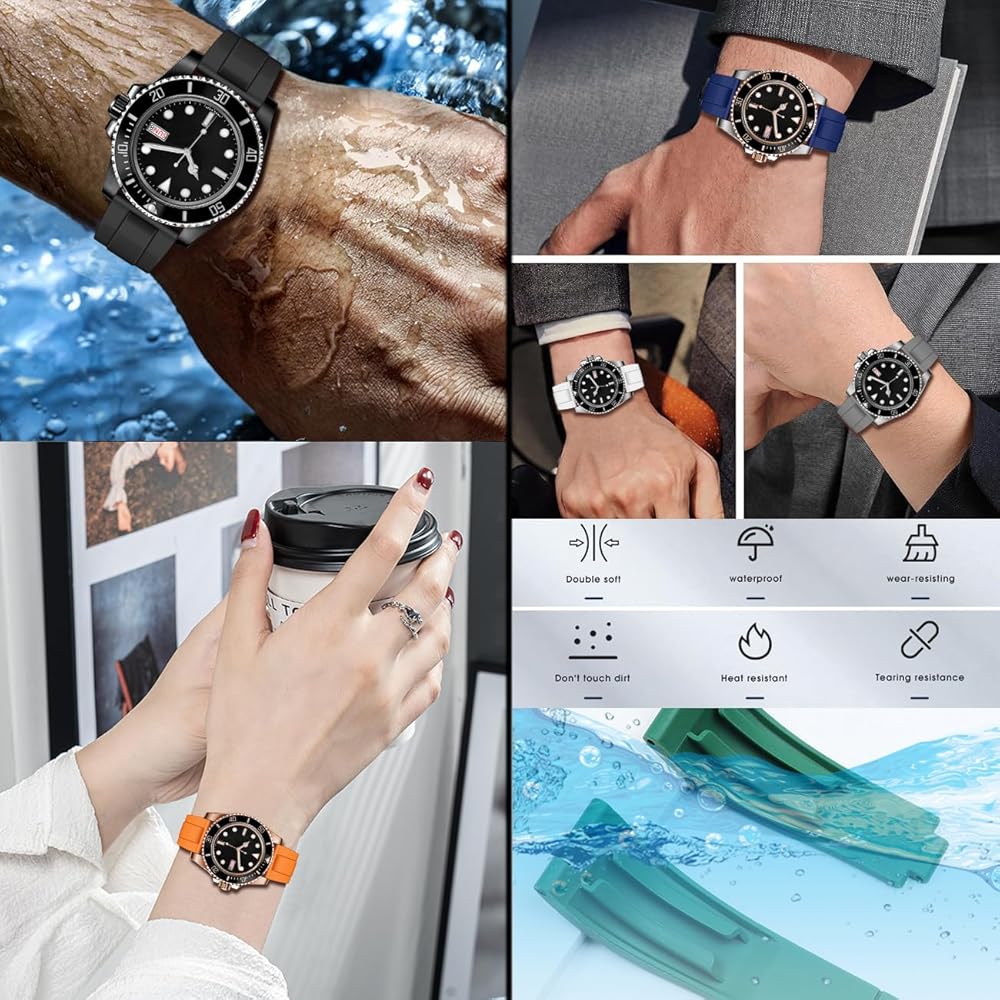 Compatible Watches: 20mm rubber replacement bands, compatible with traditional and smart round watch, fits for Rolex, Seiko, Citizen, Invicta, Nato, Omega Swatch Moonswatch, Galaxy watch 7 6 5 4 and other popular brands; 22mm rubber replacement bands, compatible with traditional and smart round watch, fits for Galaxy Watch 46mm, Galaxy Watch 3 45mm, Gear S3 Classic