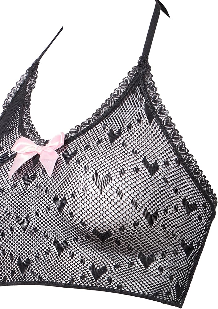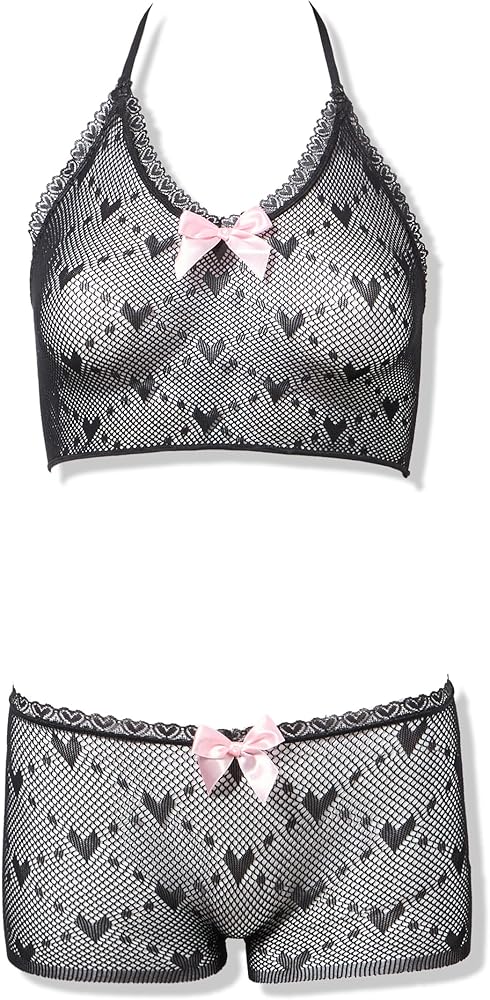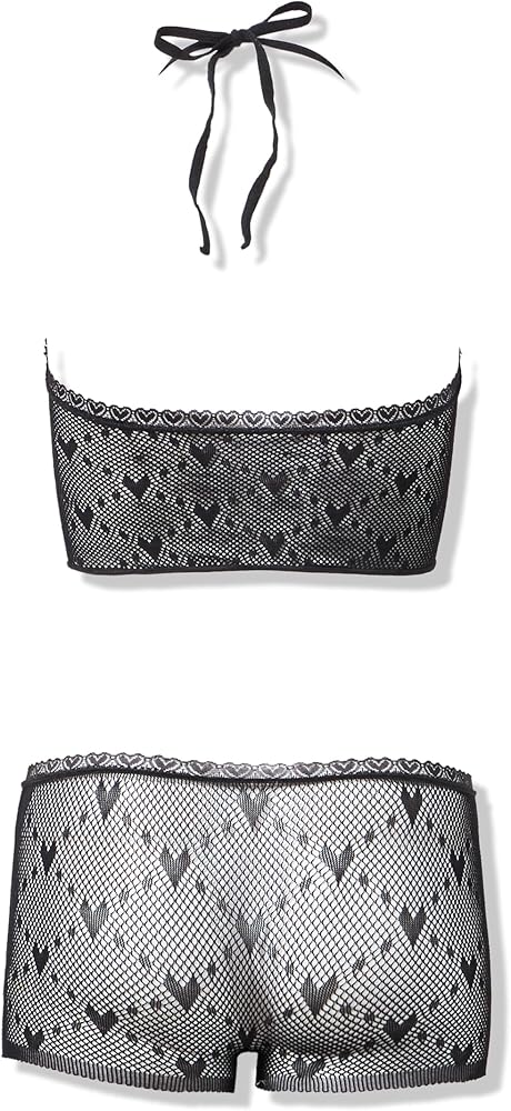 Have them falling head over heels in this 2 PC mini heart fishnet lingerie set by Leg Avenue. The cute lingerie halter top features mini heart trim, a pink bow detail, and a neck tie for you to find the perfect comfort fit. Featuring the same breathable see through lingerie fabric, the matching boy shorts include mini heart trim around the waist, pink bow detail, and a cheeky fit around the bottom for a look that is irresistible. Whether it's your white lingerie bridal set, birthday lingerie, or sexy lingerie look for Valentine's day, you'll be their favorite gift to unwrap in this sexy women's lingerie set. One Size Fits Most Adults. Hand wash cold, Do not bleach, Drip dry
