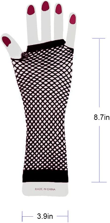 • Long fishnet gloves: Elbow-length (Gloves may reach elbow or just below elbow depending on the length of your arms); Short fishnet gloves: Palm length (It reaches your wrist for most people)