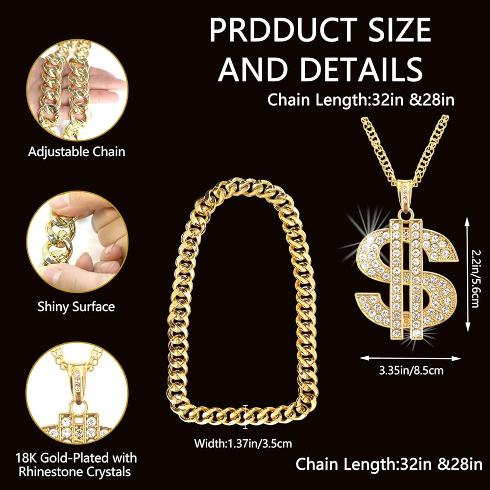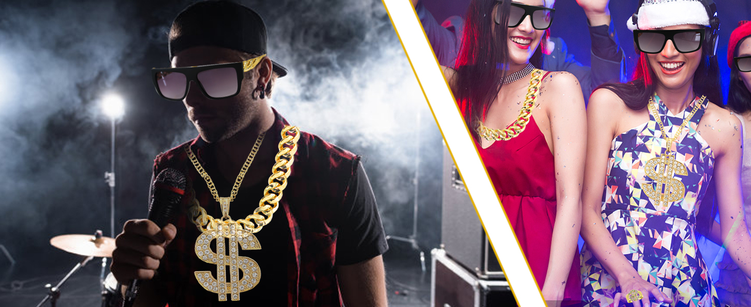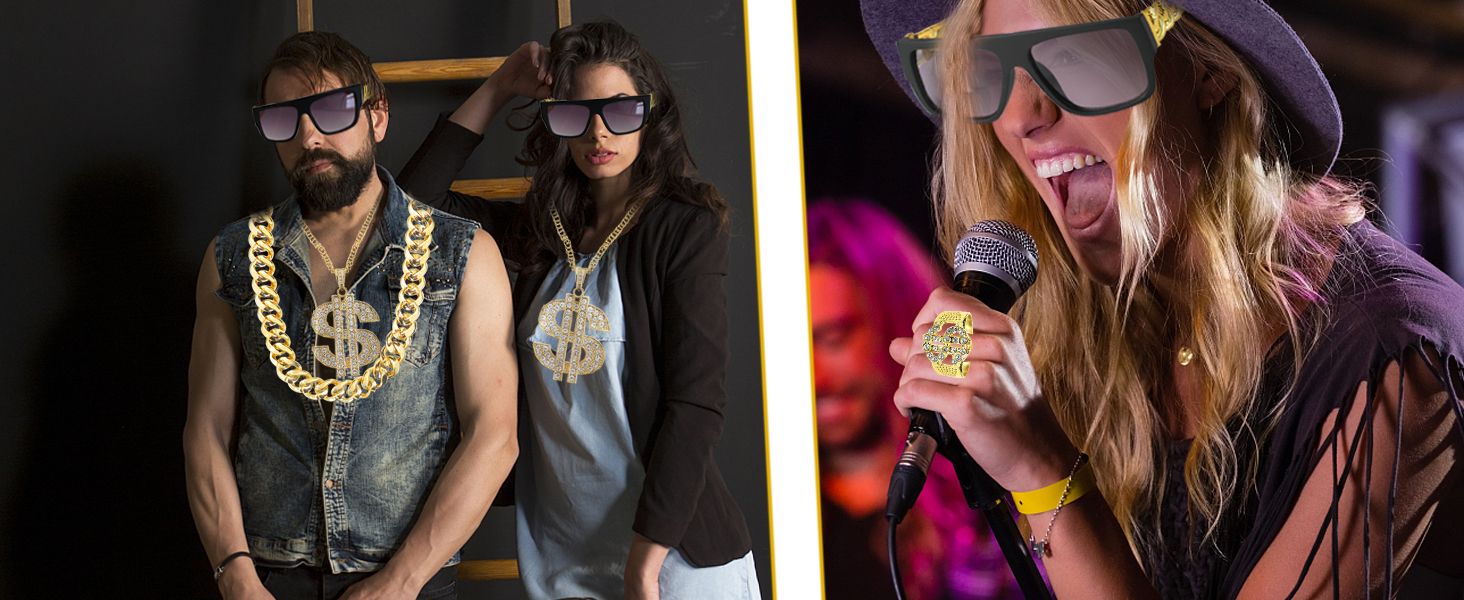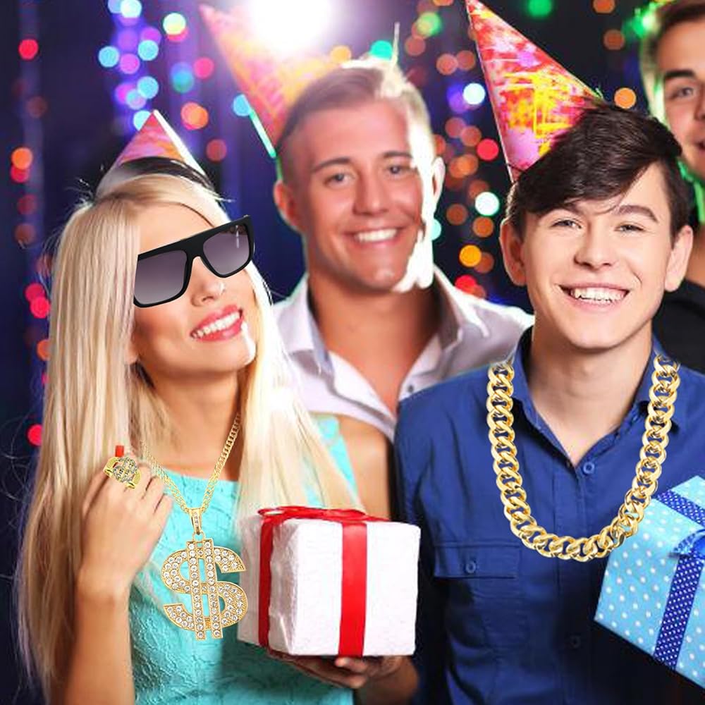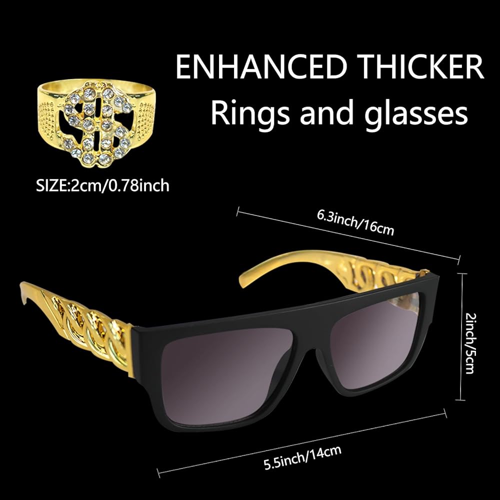 【Versatile and Suitable for All Occasions】 - Whether you're hitting the stage as a rap star, attending a themed party, or just want to spice up your everyday look, these accessories are designed to complement any outfit. The dollar necklace chain and finger ring add a touch of bling to your look, while the fake gold necklace and hip hop sunglasses complete the ensemble with a dash of cool.