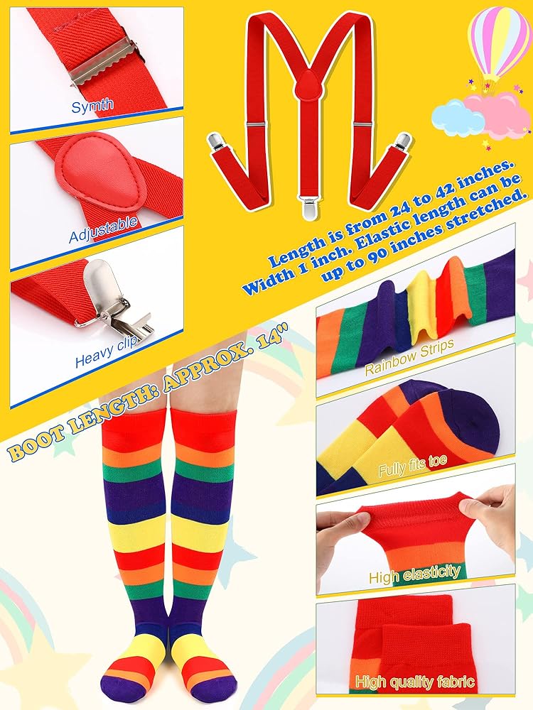 Size Information: the rainbow propeller hat is about 22 Inches/ 56 cm in head circumference, the bow tie is adjustable for a comfortable fit, the suspender is about 39.37 inches/ 100 cm long and 0.98 inch/ 2.5 cm wide, the tube socks are about 14 inches/ 35.56 cm long, suitable for most men and women to wear