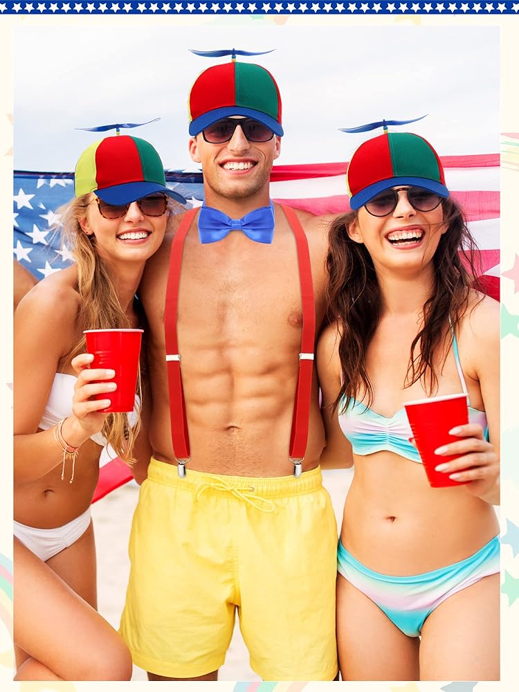 Quality Material: the hat with propeller is made of quality plastic and polyester, with bright colors and interesting design, the bow tie is made of quality rayon, soft and smooth to touch, the adjustable elastic suspender is convenient and comfortable to wear