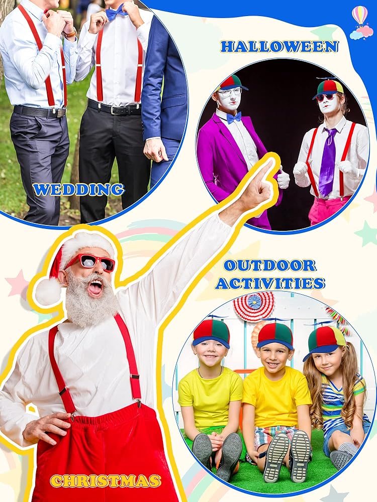 Cute Design: the rainbow baseball hat is designed in multicolored and equipped with a propeller, which looks very interesting, the blue suspender and red bow tie will make you look more attractive and eye catching