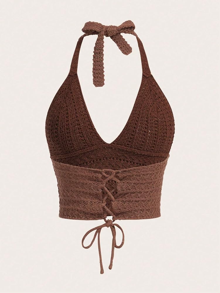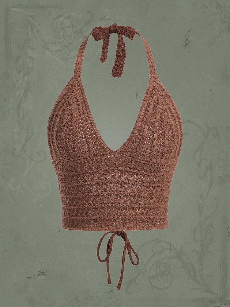 Size: There are 3 sizes (S, M, L) is great to fit for petite girls and plus size women. Black backless halterneck crochet crop top, brown v neck knitted halter cami, Summer y2k burgundy crochet halter top is great to flatter your figure.