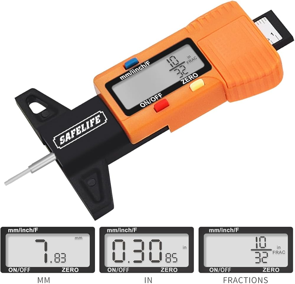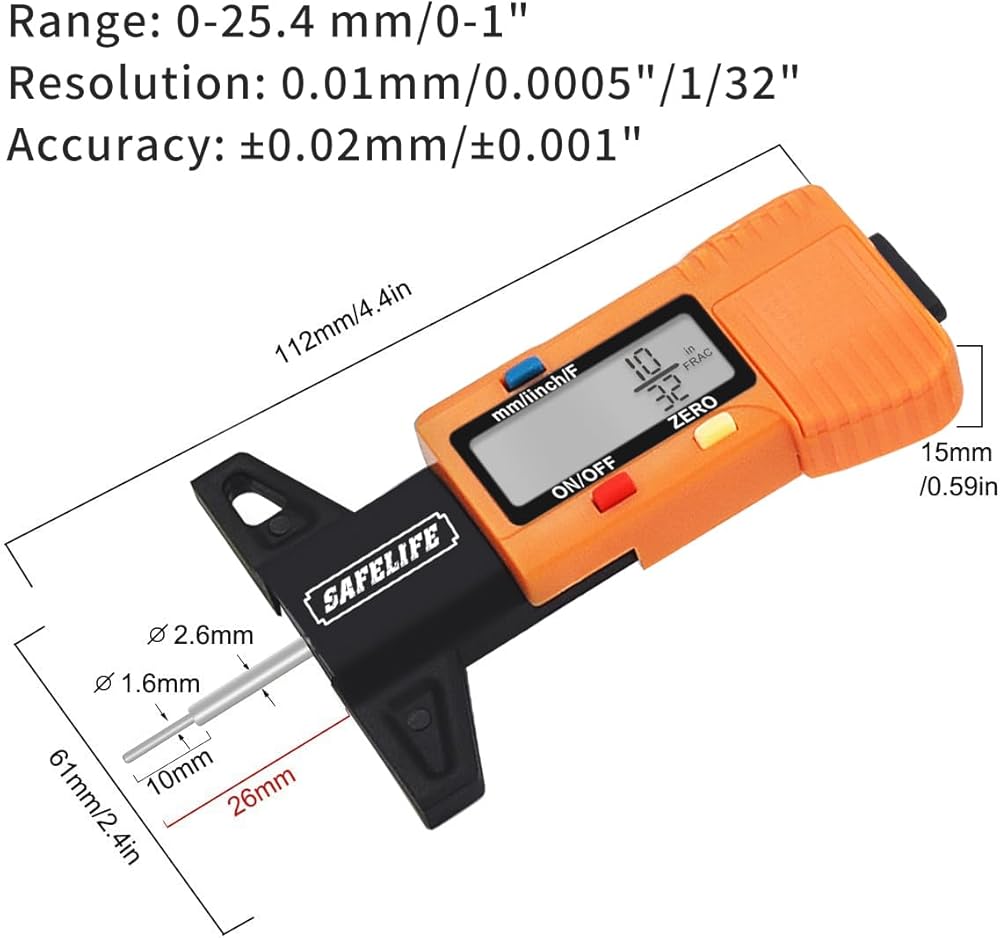 3 MODES READABLE RANGE: Accuracy tire tread depth gauge has One-touch switch for Metric MM and SAE with option of decimal or fractional inch interchange. Readable range - able to show tread depth from 0-25.4mm in metric or 0-1-inch in sae (32/32-inch).