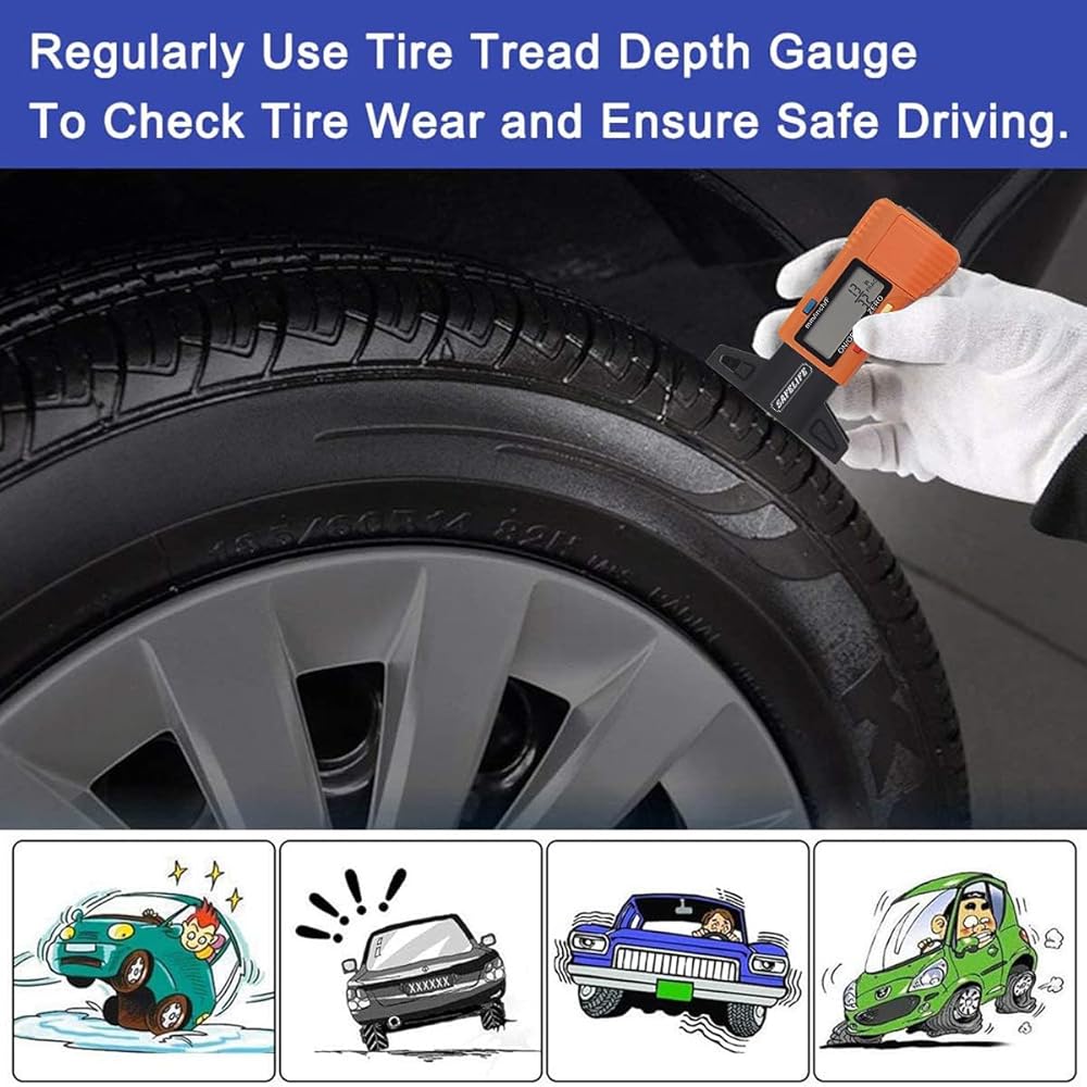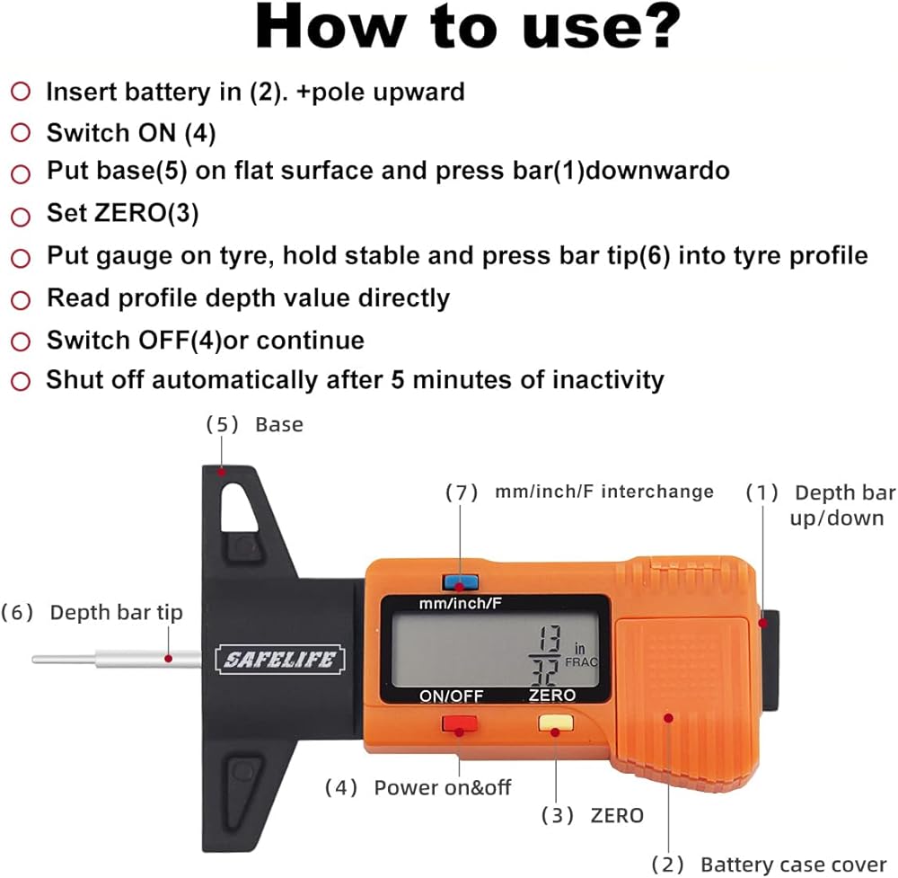 LARGE LCD DISPLAY: Digital screen makes tire depth gauge easier to read. The depth bar with scale, also can be meansuread the tire depth when the digital tire tread depth gauge's battery has run down.