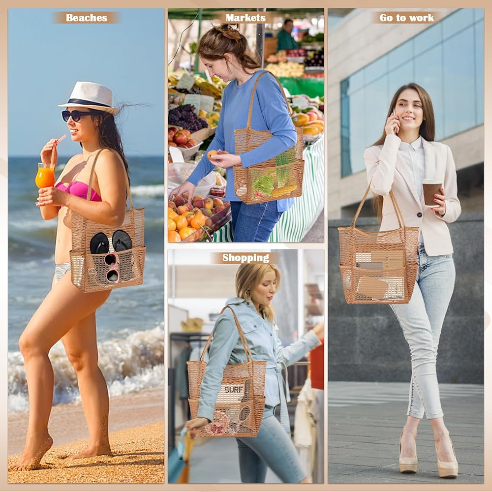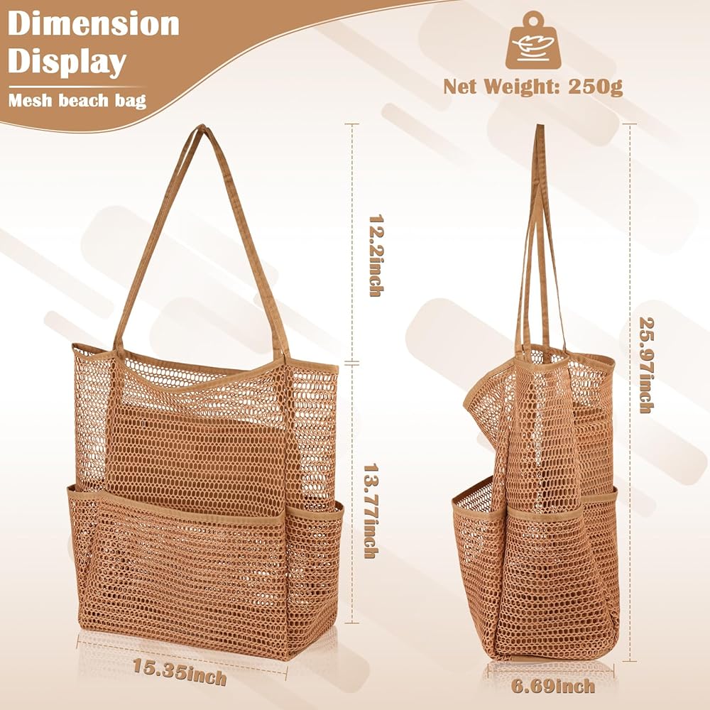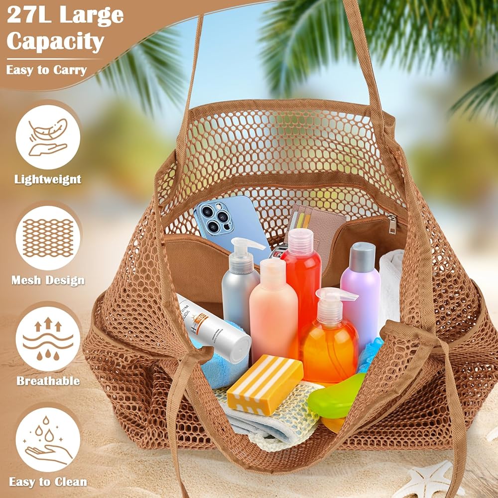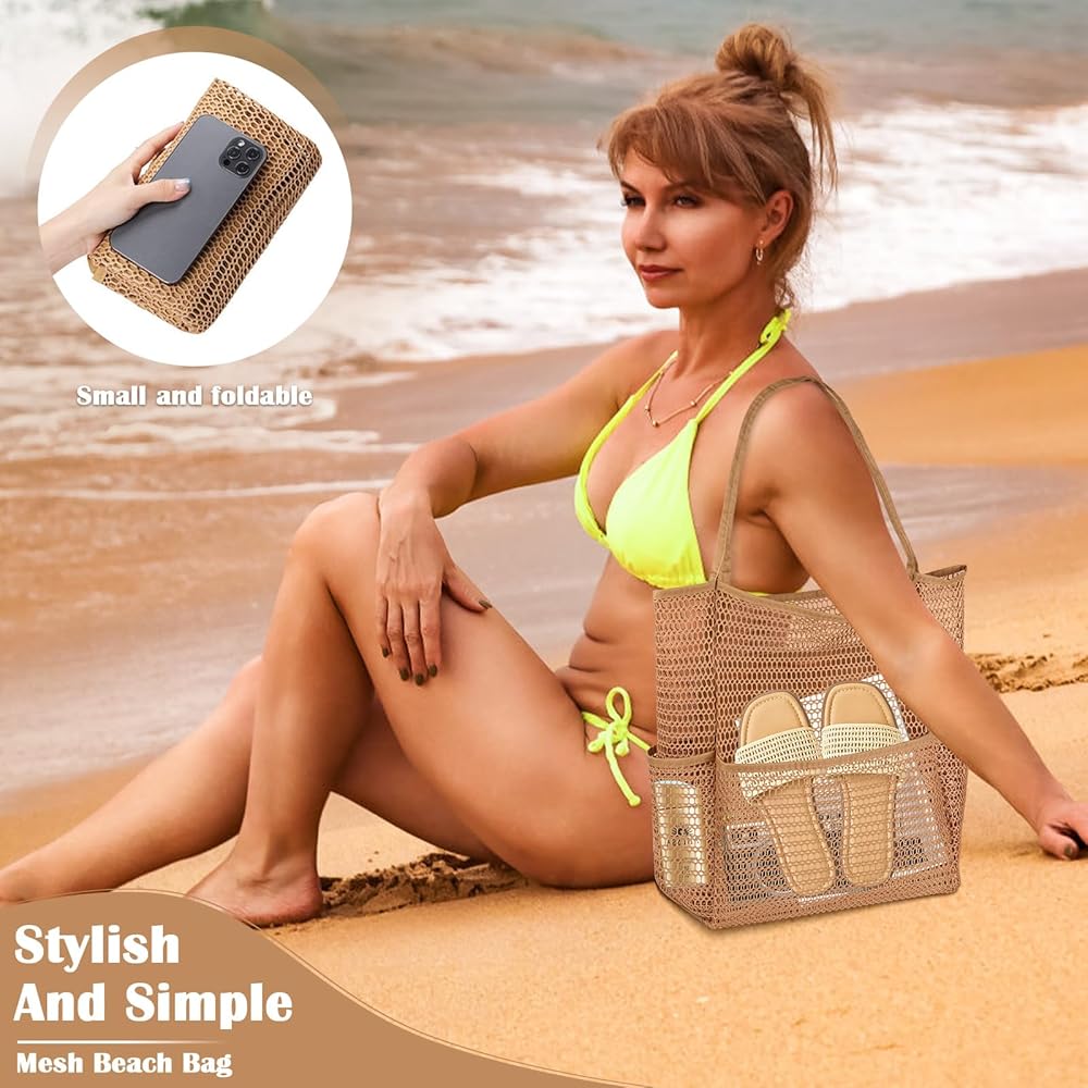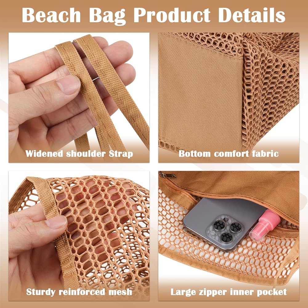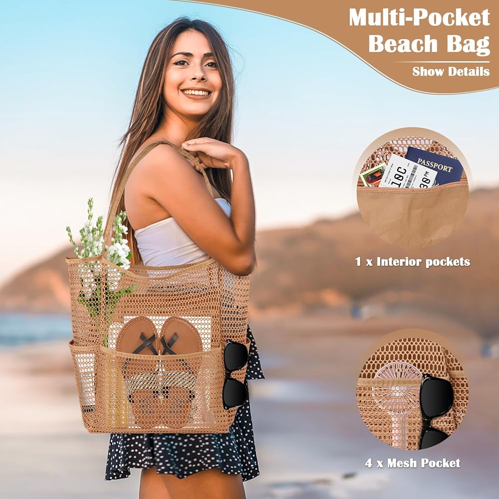 🌊Beach Tote with Multi-Pocket: Mesh beach bag has 1 large main compartment, 1 inner zipper pocket, 4 outer pockets. Multi-pocket design provides a storage place for each of your different items for easy access, and the inner pocket with zip can be a good place to keep your wallet, mobile phone, keys and other valuables.