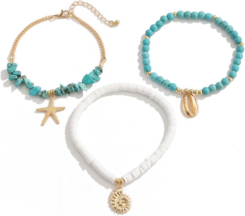 Embrace the carefree boho aesthetic with these surfer beach anklets, which incorporate natural materials such as alloy, polymer clay, turquoise, starfish and seashell, creating a look that's both rustic and refined.