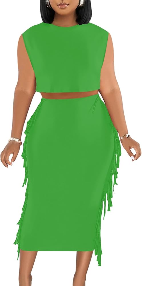 - Women's two pieces sets with a crew neck tassel sleeveless crop top and a high waist tassel trim bodycon midi skirt.