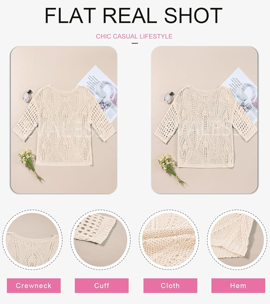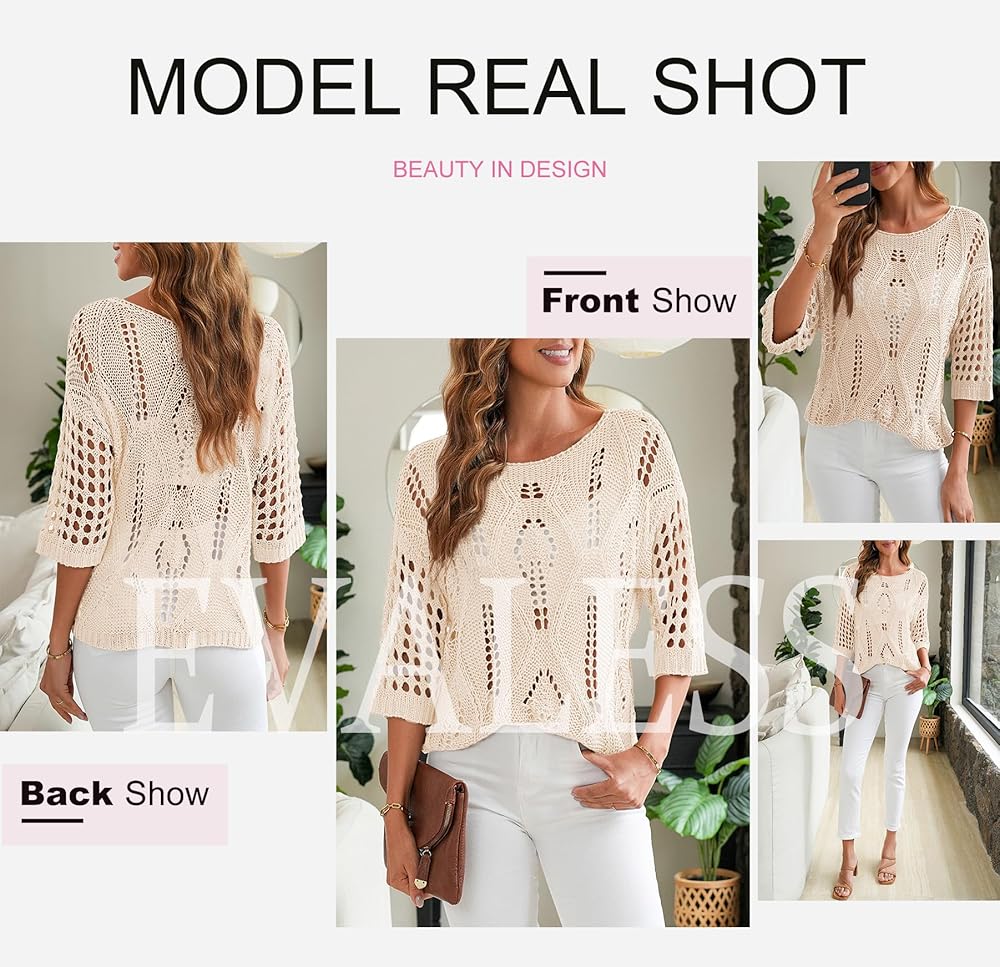 EVALESS Women's 2025 Spring Summer Crochet Hollow Out 3/4 Sleeve Pullover Sweater Off Shoulder T-Shirts Off Shoulder Tops for Women Bathing Suit Cover Up for Women