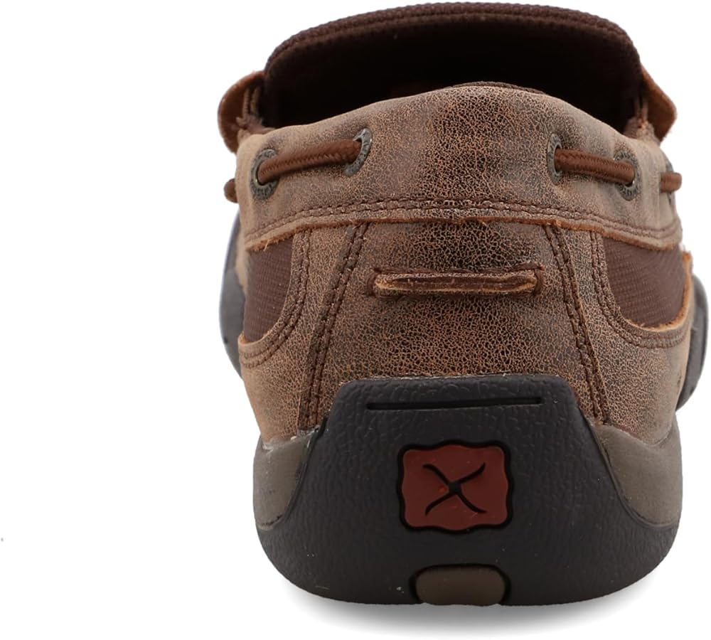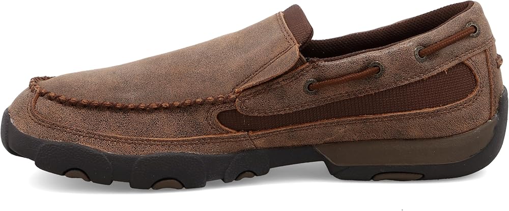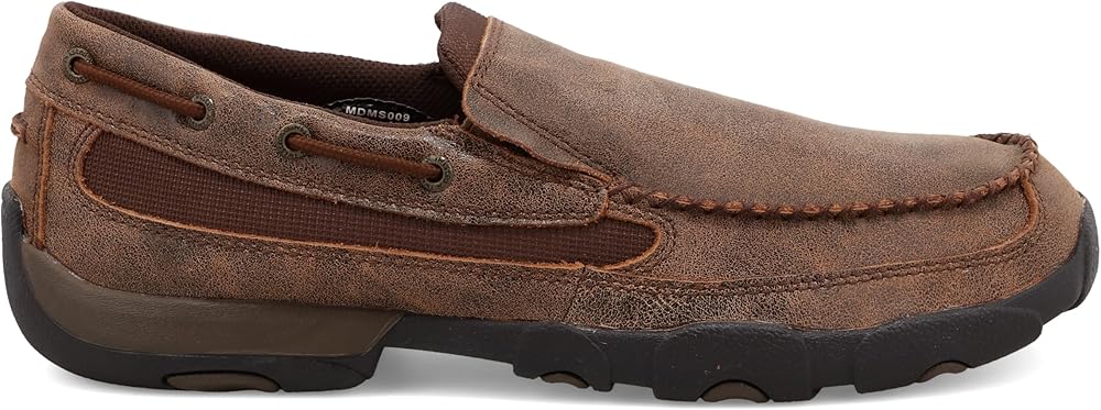 The men's casual slip-on driving moc in an ecoTWX material combined with durable fabric, features Twisted X's patented CellStretch comfort technology, ensuring that every step you take is backed by superior comfort. The slip-on moc has double gore panels that flex for ease of sliding on yet conform comfortably to the foot without the need for laces. The compression-molded EVA midsole with integrated CellStretch tech, along with a molded rubber outsole provides the unmatched stability and durability you need to carry you from one adventure to the next.