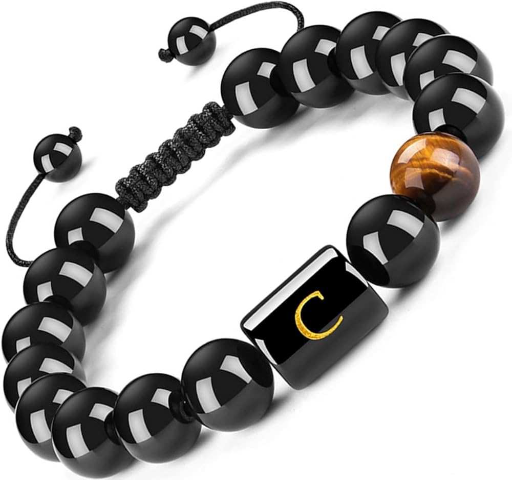 FRG Initials Bracelets for Men Letter Link Handmade Natural Black Onyx Tiger Eye Stone Beads Braided Rope Meaningful Bracelet