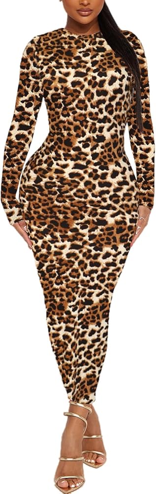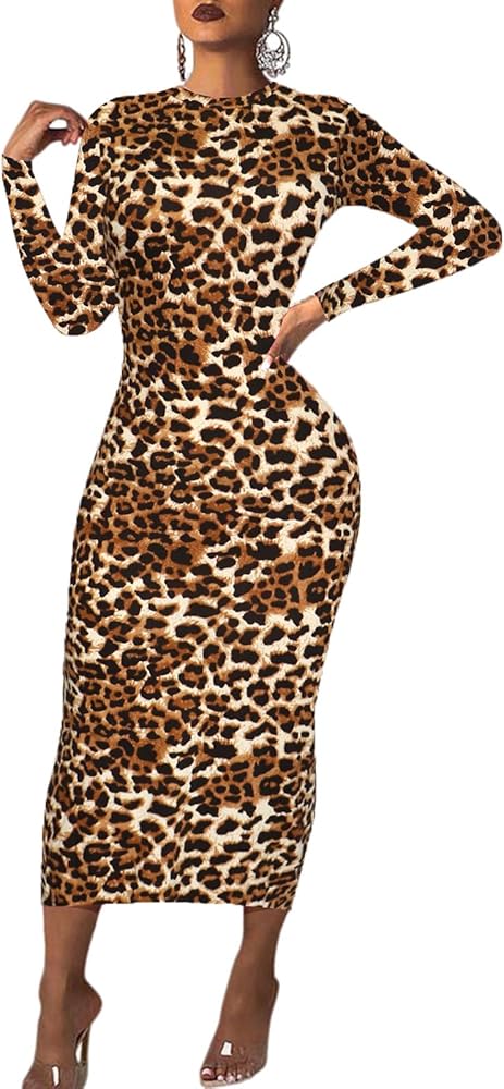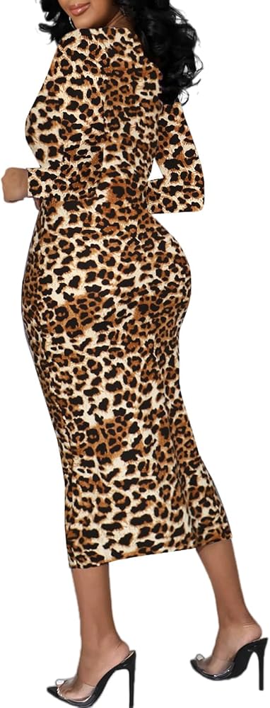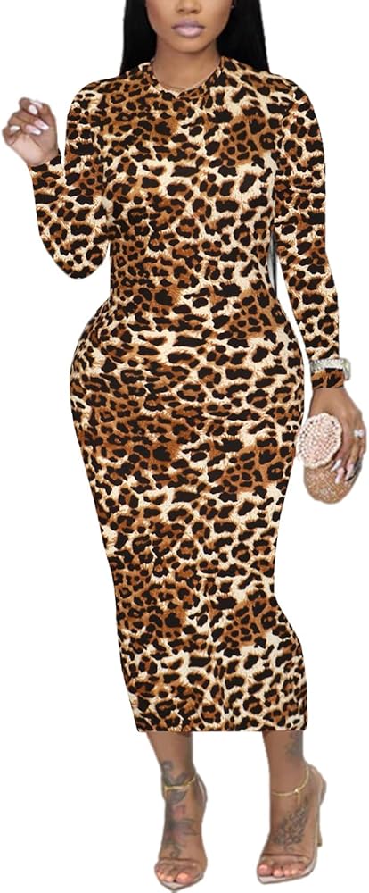 Long Midi Bodycon Dress for Women - Animal Print Casual Fall Tight Going Out Birthday Dresses