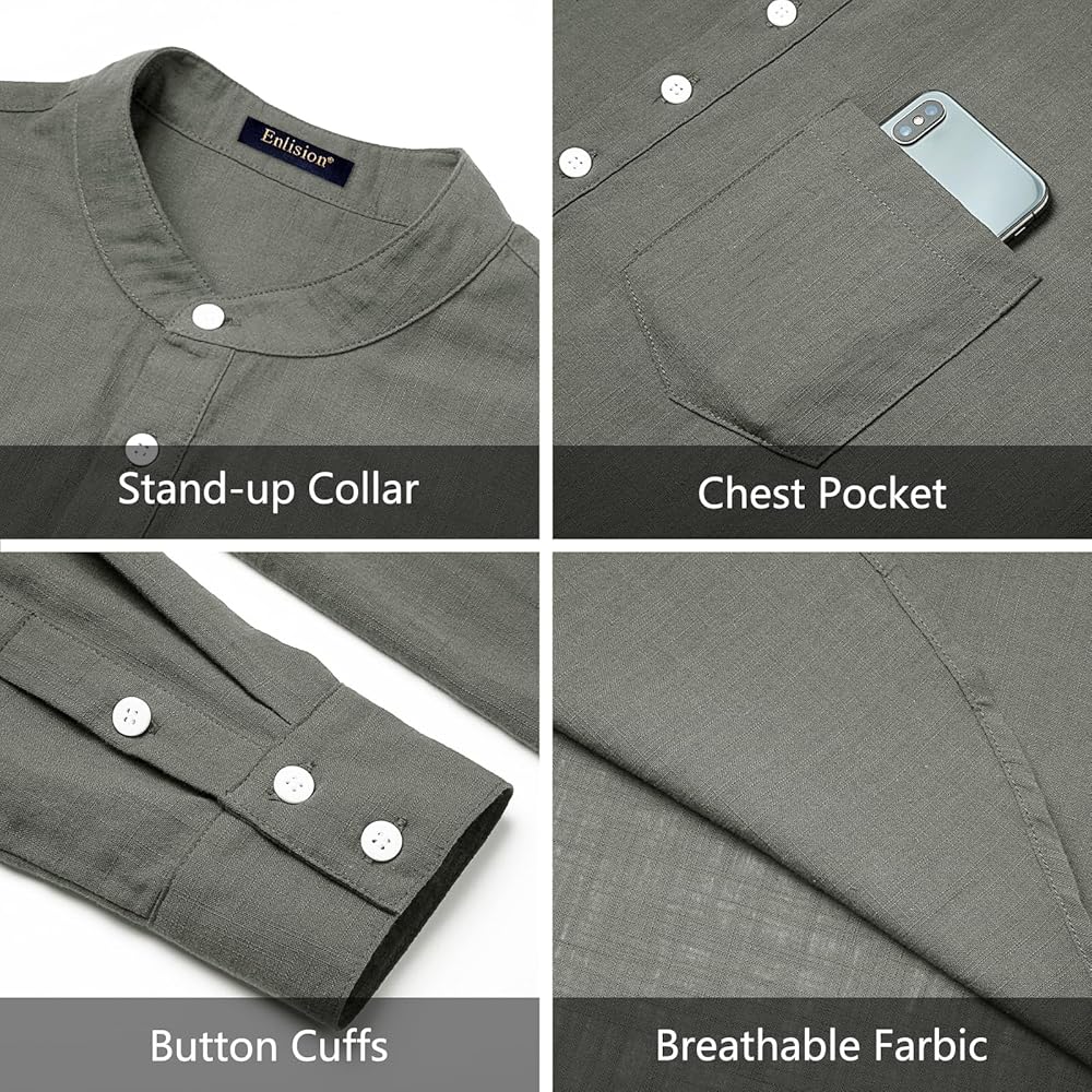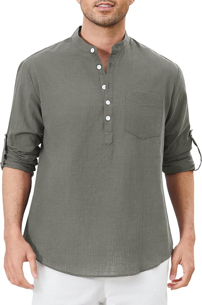 DESIGN: Casual hippie beach linen shirt, simple style, long-sleeved collarless, rolled sleeves, 5 front buttons, a real pocket, solid color, round hem, loose fit and lightable.