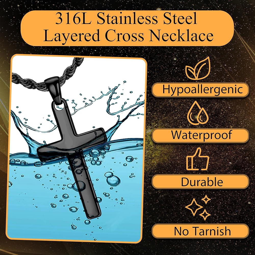 【Stainless Steel Necklace】:Crafted from 316L stainless steel, our cross chain for men is built to last. Hypoallergenic, waterproof, and resistant to fading, it ensures lasting beauty without causing skin irritation. Expertly polished for a smooth finish, it offers comfort whether worn day or night, during showers, sleep, or workouts.