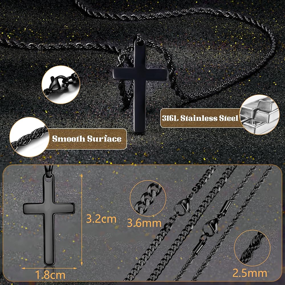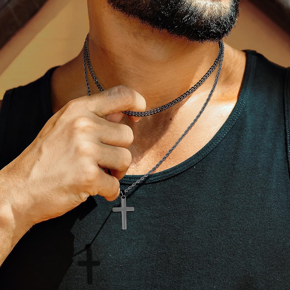 【Layered Cross Necklace】: Cross chain presents two exquisite designs: Cuban chain + rope chain or snake chain + Square Rolo Chain. Available in three colors: silver cross necklaces for men, gold Cross necklace, black cross chain, these mens cross necklaces offer versatility. Each mens cross necklace is individually, allowing you to wear it individually or mix and match for a personalized style statement.