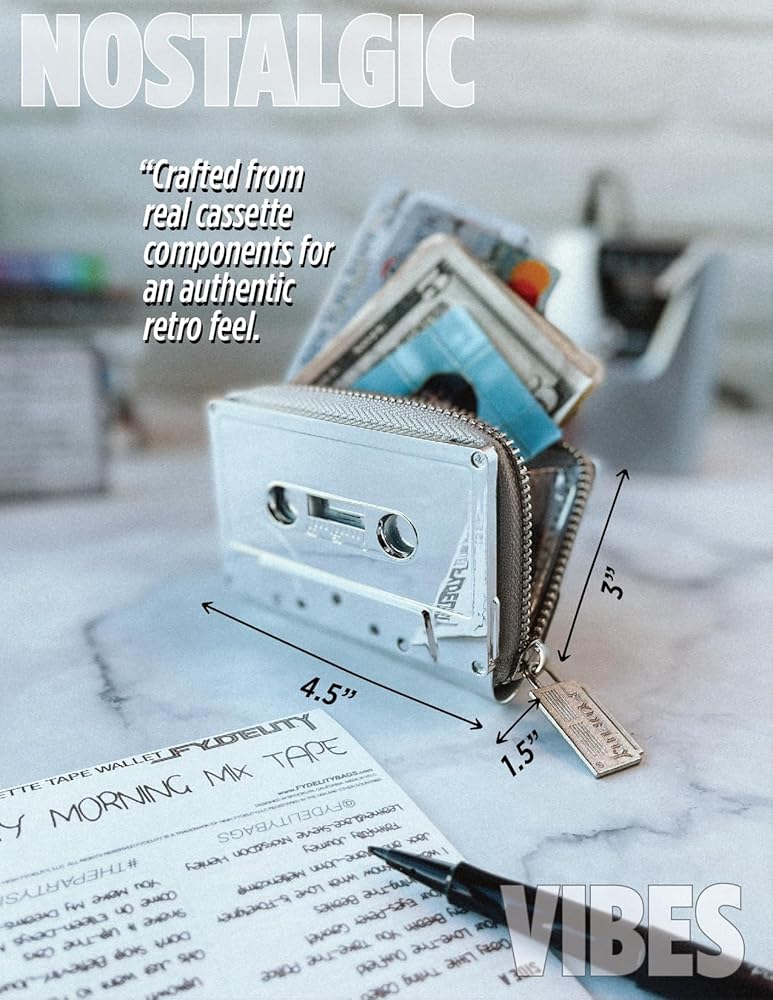 DESCRIPTIONMixtapes were more than music—they were a way to say what words couldn't. The Retro Cassette Mixtape Wallet takes that emotion and wraps it in a pocket-sized accessory that's as functional as it is nostalgic. Made from real cassette components and high-quality vegan leather, it's a wallet that doesn't just hold your essentials—it holds memories.