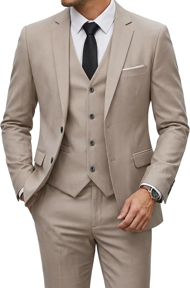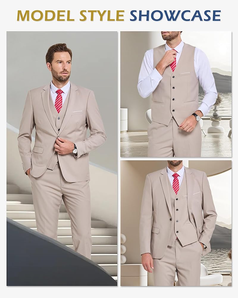 3-PIECE SUIT WITH 3D DRAPING: Two-button jacket, matching vest, and pants, plus a complimentary tie. Available in sizes XS to 3XL and 22 colors. Features real pockets and chrome buttons. The 3D draping process fits your shape and emphasize your figure