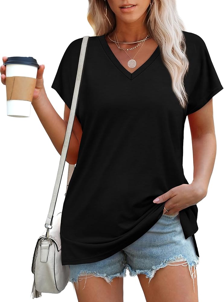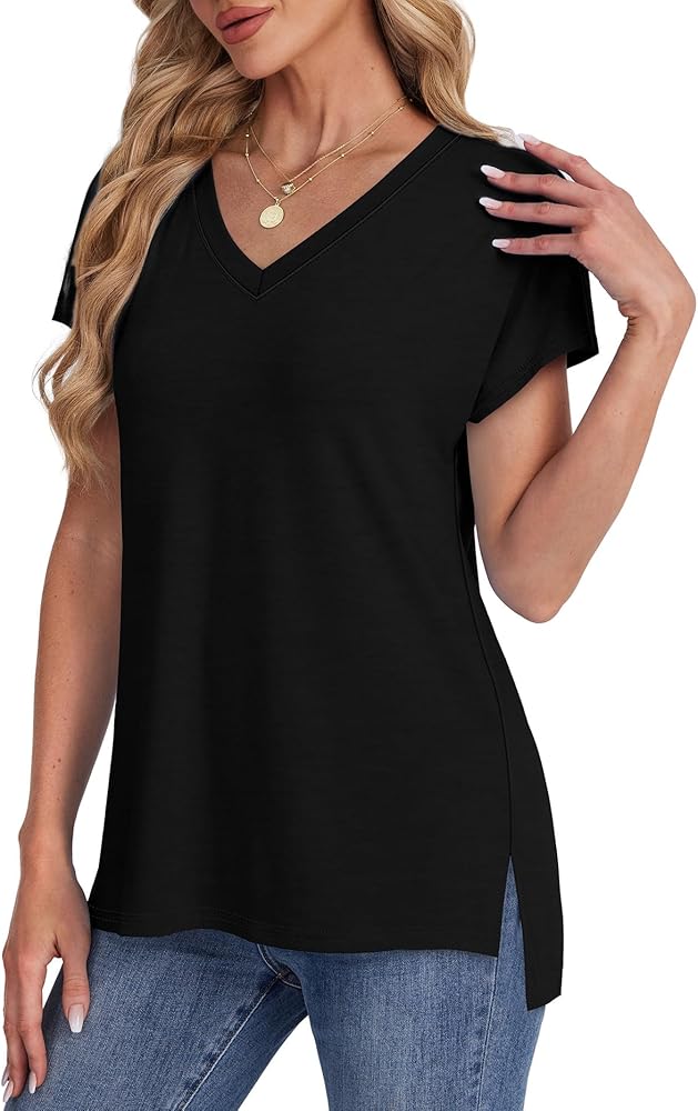 Feature: Womens summer tops,v neck t shirts for women,cap sleeve tops for women,stylish split hem design,solid color t-shirts are classic and a must-have in everyone's wardrobe!