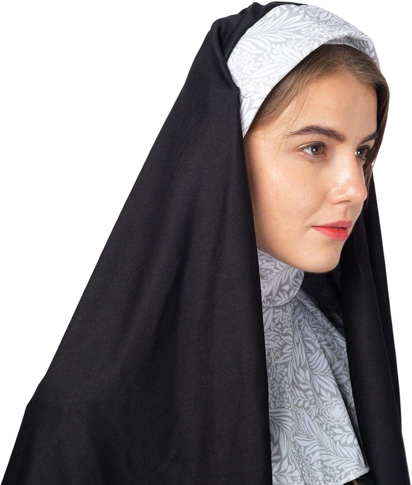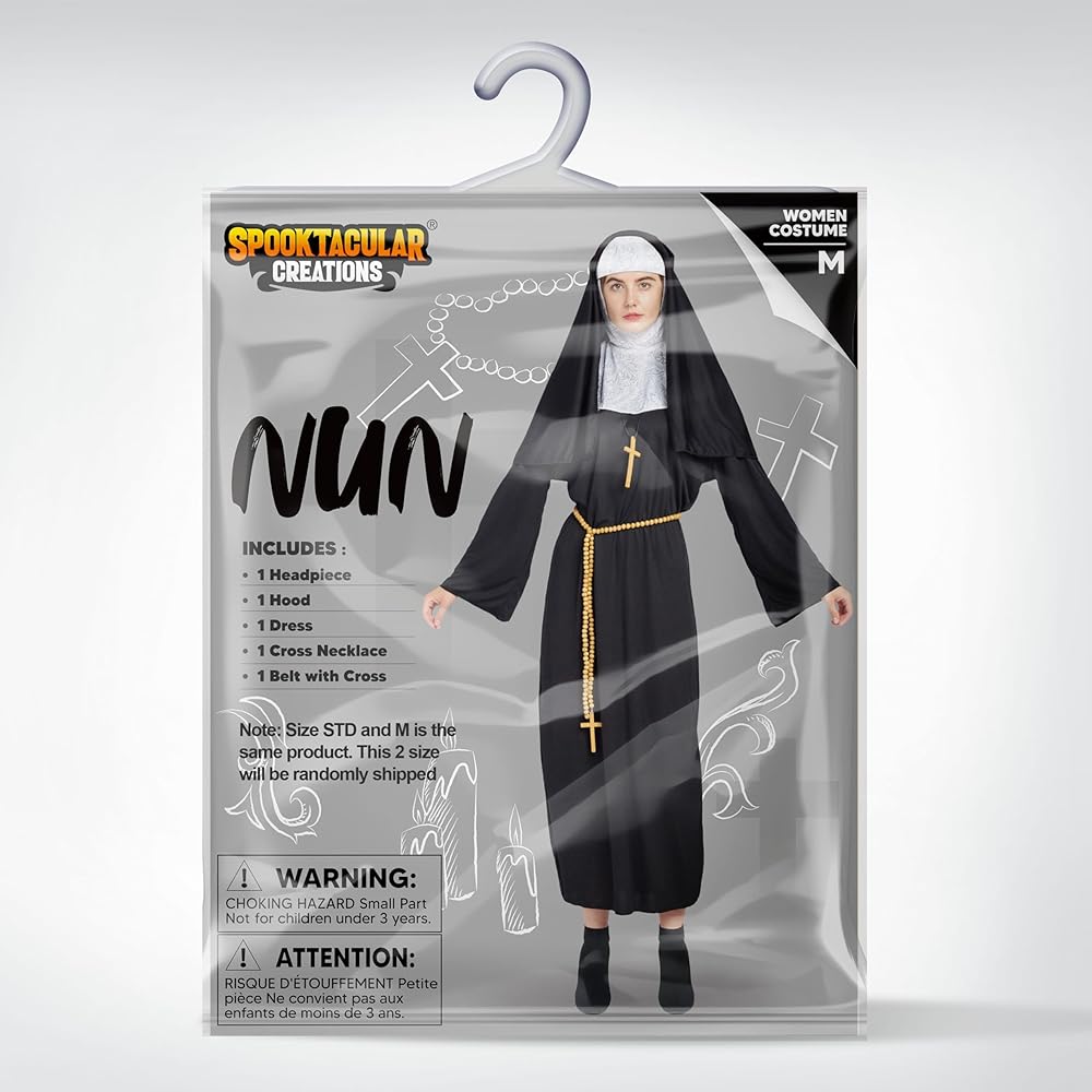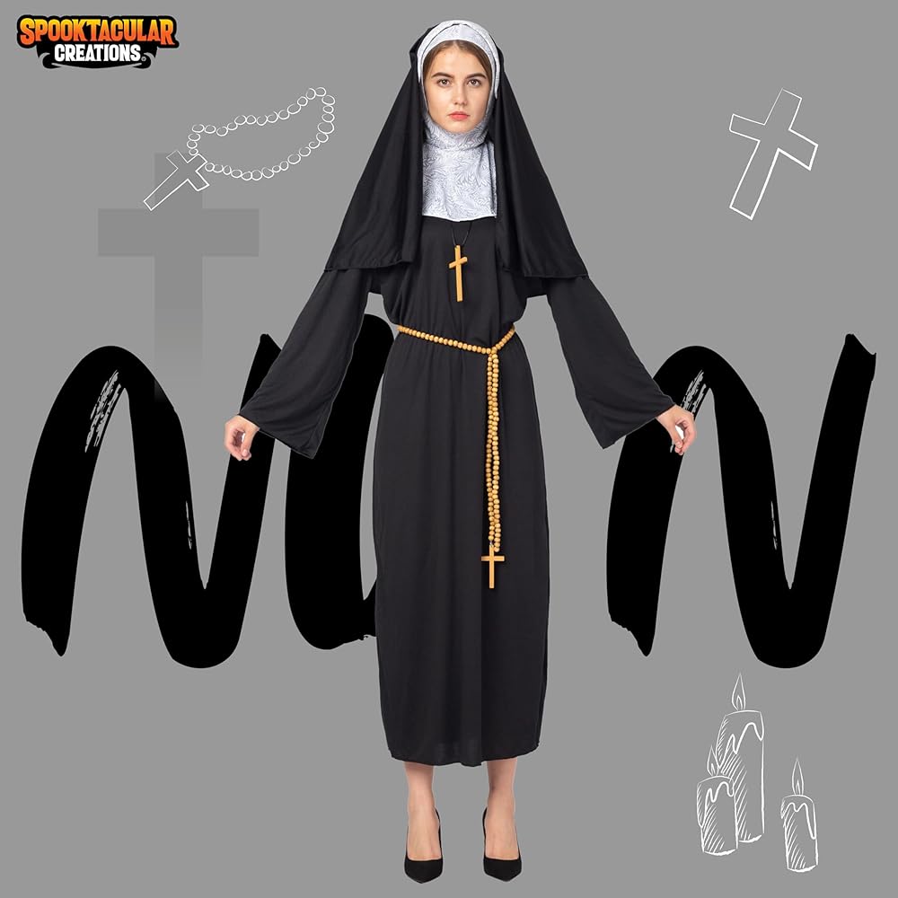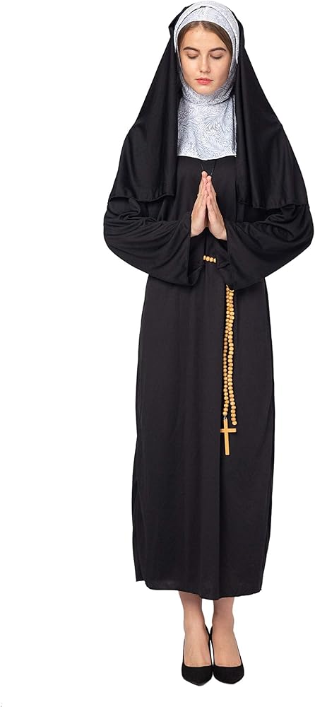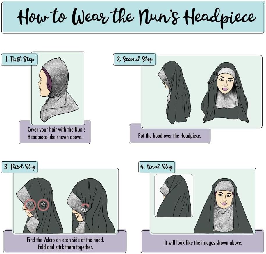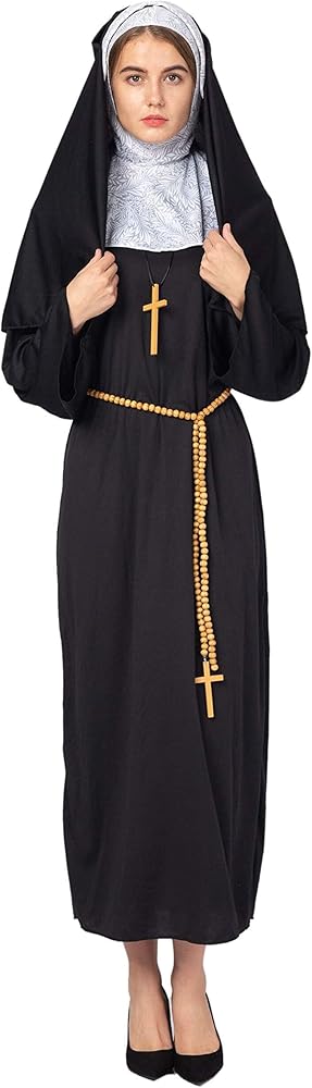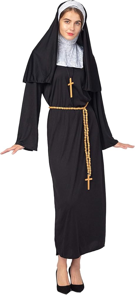 Nun accessories for women includes a nun dress, headpiece with Collar, hood, cross necklace, and cross belt. Instructions Included for The Hood and The Headpiece.