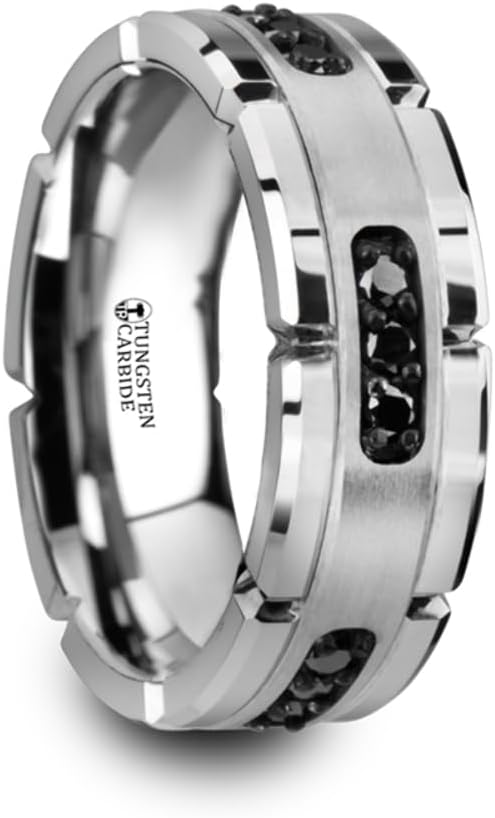 This bold Thorsten Tungsten Carbide ring has a grooved band with polished notches a marvelous silver inlay with inset stunning round-cut, black diamonds. The ring?s nine black diamonds encircle the ring halfway in groups of three. Engraving available! See Pictures for Details. Does Not Delay Order. Includes Thorsten Lifetime and Lifetime Sizing Warranty (excluding re-engraving). Total carat weight of the black diamonds is 0.27 ct. Tungsten Carbide - the newest and strongest metal for jewelry that does not scratch easily. Comfort Fit - domed interior band slides over the knuckle easier with less friction