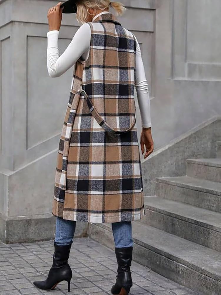 IDEALSANXUN Womens long plaid vest sleeveless trench coat blazer jackets open front cardigan sweaters outerwear waistcoat