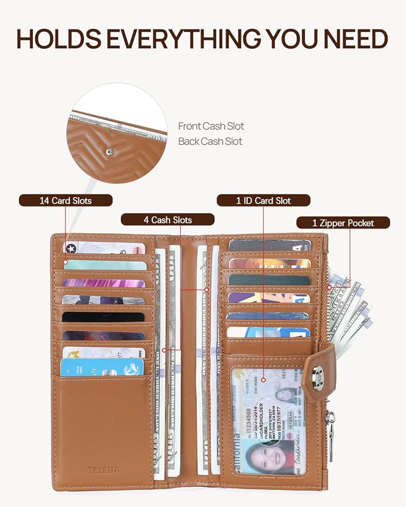 Compact & Functional Design: This Telena womens wallet features a large capacity with 14 card slots, 6 cash slots, and 1 ID card slot. The inclusion of a zippered compartment adds extra security for coins or cash, making it the perfect card holder for women who value both style and functionality
