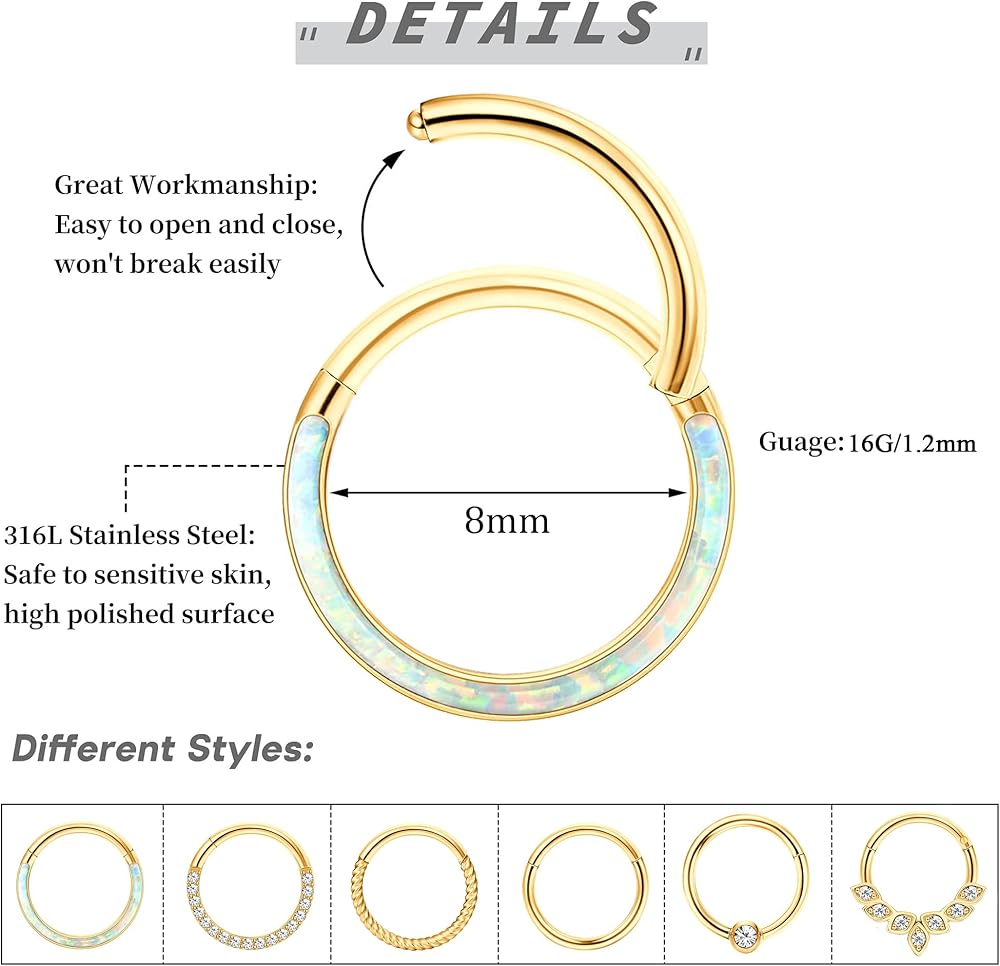Multi-Function: The hinged clicker hoops can be use as nose rings hoop, septum ring, daith piercing jewelry, helix earrings, conch piercing, rook hoops, cartilage earrings, lip rings, etc