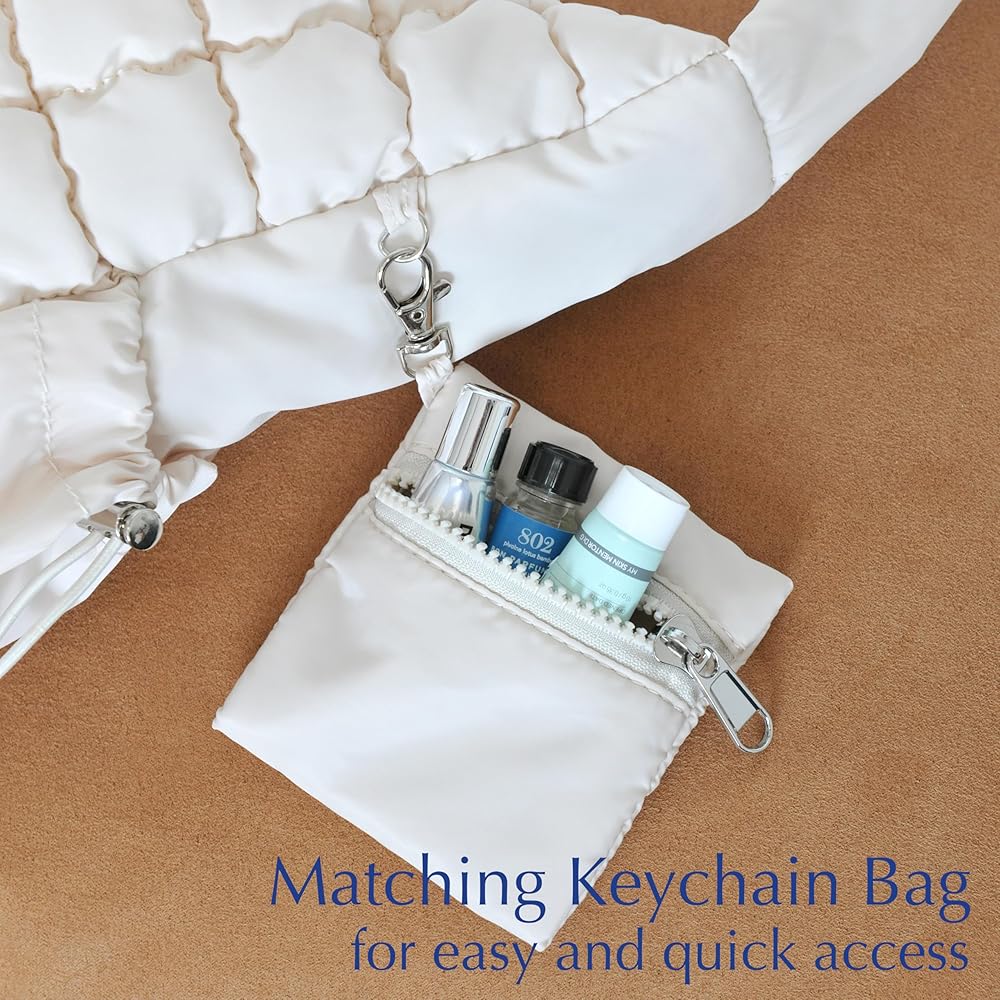 Multiple Pockets Design, A spacious main compartment and drawstring closure of two side pockets. Interior contains 1 zippered pocket and 1slip pouch. The puffer handbag includes a matching small keychain bag for easy to organized.