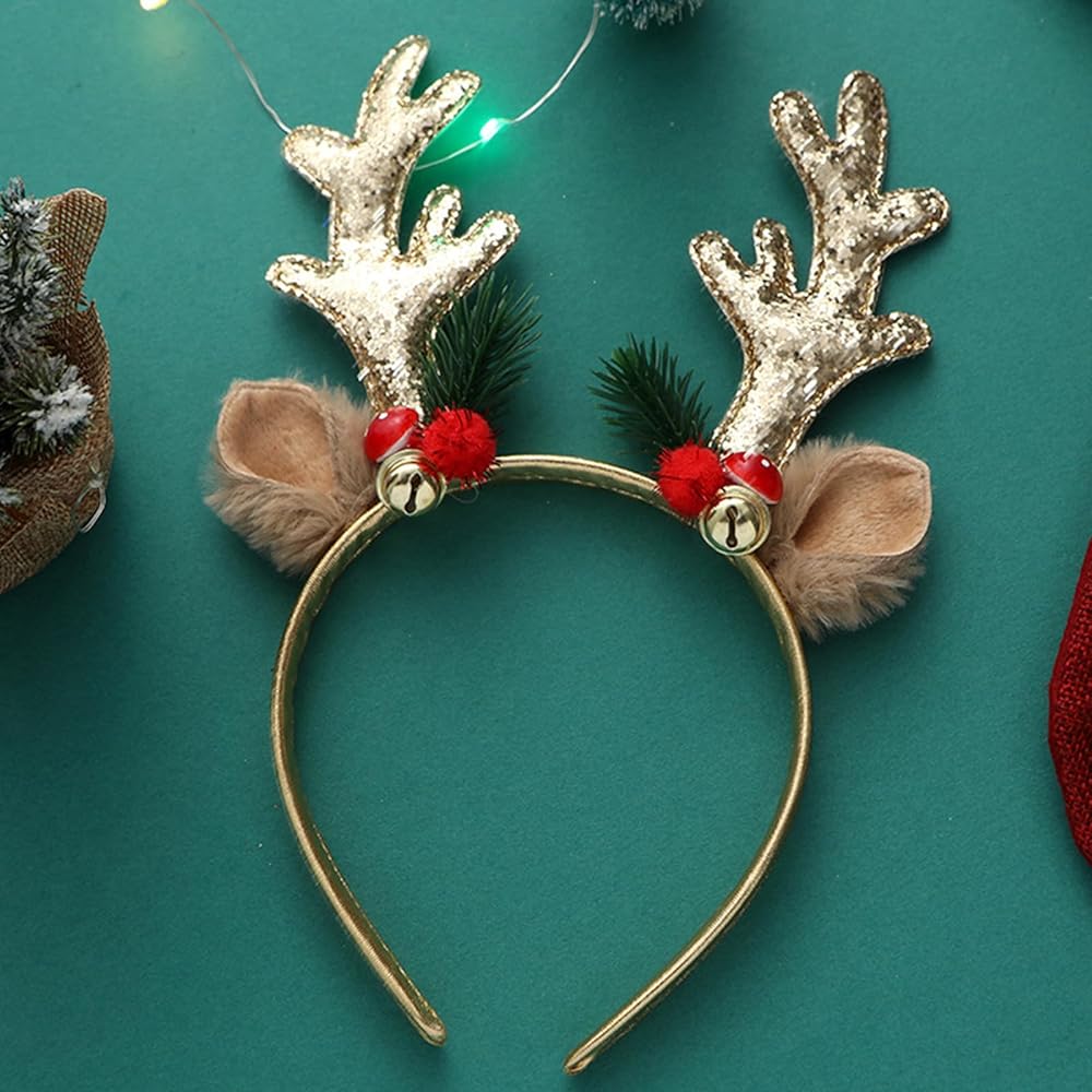 WLBON 2 Pcs Christmas Reindeer Antlers Headband Deer Ears Elk Horns Hair Hoops Bands Xmas Tree Bells Animal Headpiece Hairband Women Halloween Festival Dress Up Birthday Party Accessories Red Golden